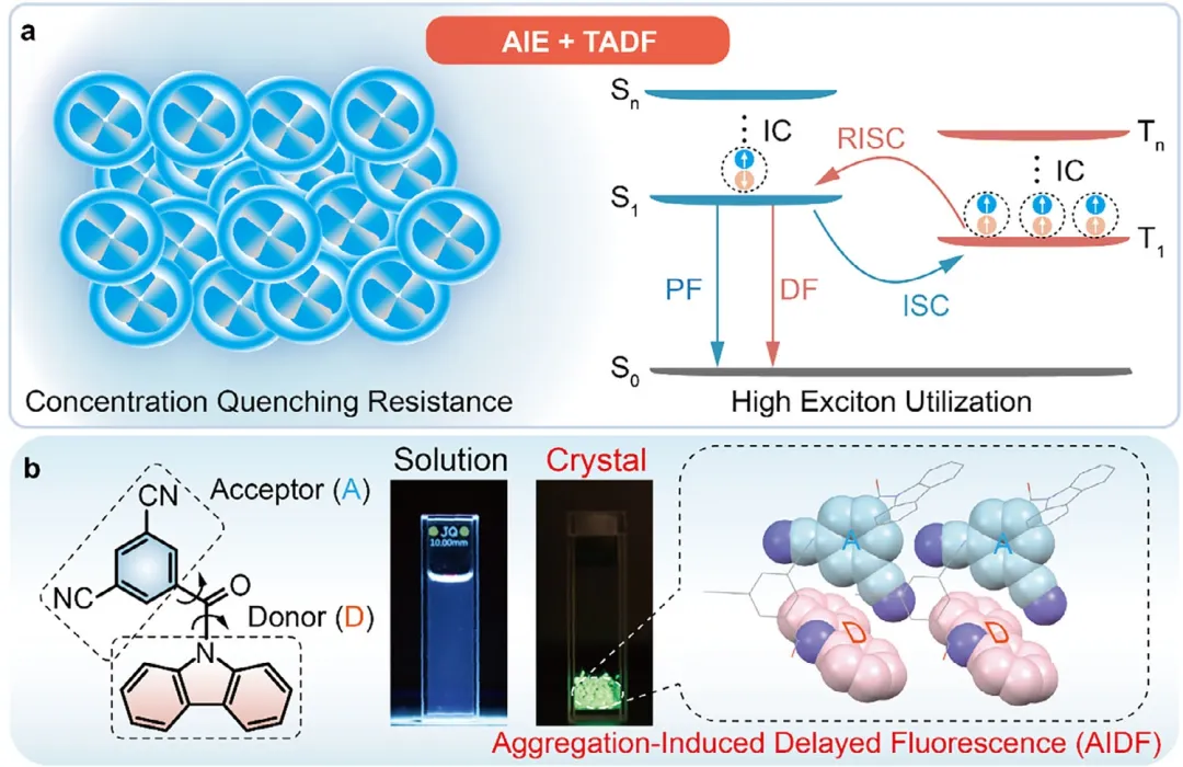 大家好,今天为大家分享来自南京邮电大学陶冶教授、徐申教授团队与山东大学刘颖教授团队近期在 Advanced Science 上合作发表的研究论文具有优异光电性能和良好加工性的有机X射线闪烁体 (OXSTs) 在下一代辐射探测和医学成像领域极具吸引力。然而,由于聚集导致猝灭 (ACQ) 从根本上抑制了辐射过程,因此实现兼具高激子利用效率的高效固态发光仍然是一项艰巨挑战。在此,我们提出了一种分子间聚集诱导延迟荧光 (AIDF) 策略,该策略结合了聚集诱导发光和热激活延迟荧光的特性。所设计的发射体通过空间电荷转移,实现了亚微秒级延迟寿命的高效AIDF,从而能够有效利用单线态和三线态激子。将此类发射体掺入聚砜基质后,所得复合薄膜在较宽的浓度范围内展现出明亮且稳定的辐射发光,并且在X射线激发下表现出优异的抗浓度猝灭能力。得益于大的斯托克斯位移、快速的反系间窜越以及高效的辐射发光,所制备的闪烁体实现了0.255 µGy s⁻¹的超低检测限和20.0 lp mm⁻¹的高空间分辨率,性能优于大多数有机闪烁体,甚至超过部分无机闪烁体。此外,这些柔性、均匀且透明的闪烁屏还具有出色的光稳定性,可用于高质量X射线成像。本工作建立了一种实用的分子设计范式以规避聚集导致猝灭问题,并凸显了分子间AIDF在实现高效激子利用方面的独特优势,从而为高分辨率薄膜闪烁体的开发铺平了道路。关键词:聚集诱导延迟荧光、高空间分辨率、有机X射线闪烁体、薄膜、X射线成像