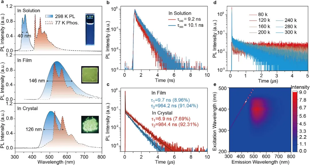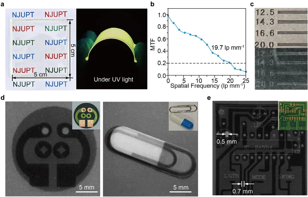 图1:(a) 示意图,展示了将聚集诱导发光 (AIE) 特性引入热激活延迟荧光 (TADF)体系中的设计思路。(b) 聚集诱导延迟荧光 (AIDF) 分子的分子结构、发光照片以及三维晶体结构,图中展示了给体和受体基团的空间排列方式。图2:(a–c) DCCz在二氯甲烷溶液 (~10⁻⁵ M)、掺杂薄膜 (聚砜中) 以及晶体中,在295 nm激发下的室温荧光、低温延迟PL光谱 (延迟时间:10 ms)。 (a) 和寿命衰减曲线 (b, c)。(d) DCCz晶体随温度变化的瞬态PL衰减曲线。(e) 室温下掺杂薄膜(聚砜中) 的激发-发射图谱。图3:(a–c) DCCz在二氯甲烷溶液 (~10⁻⁵ M)、掺杂薄膜 (聚砜中) 以及晶体中,在295 nm激发下的室温荧光、低温延迟PL光谱(延迟时间:10 ms)。(a) 和寿命衰减曲线 (b, c)。(d) DCCz晶体随温度变化的瞬态PL衰减曲线。(e) 室温下掺杂薄膜 (聚砜中)的激发-发射图谱。图4:(a) DCCz/PSF闪烁屏在明场照明下 (左) 和紫外光下 (右) 的照片。(b) 根据X射线斜边图像推导出的调制传递函数 (MTF) 。(c) 标准分辨率测试板的X射线成像:局部区域 (12.5–20 lp mm⁻¹) 的明场图像 (上) 和对应的X射线图像 (下)。(d, e) 印刷电路板、包装好的回形针 (d) 以及电子芯片 (e) 的X射线激发图像,插图为对应的明场照片。