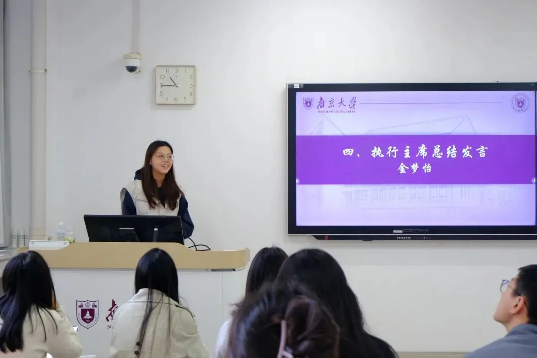 主席团成员王舒欣对四个部门的工作进行了全面总结。秘书处不断拓展部门职能,圆满举办配音大赛、烘焙观影会等活动;文体部策划开展多元文体特色活动,并积极推动多院联合;生涯发展部开辟“师”说新语读书会系列活动,举办就业经验分享会等,为同学们的学业和就业提供切实帮助;心语部成功组织了十一院联谊等活动,落实部门联通、院系联动。她感谢研会全体成员的辛勤付出,并强调各部门需有序推进各项工作,站好最后一班岗,为本学年画上圆满句号。