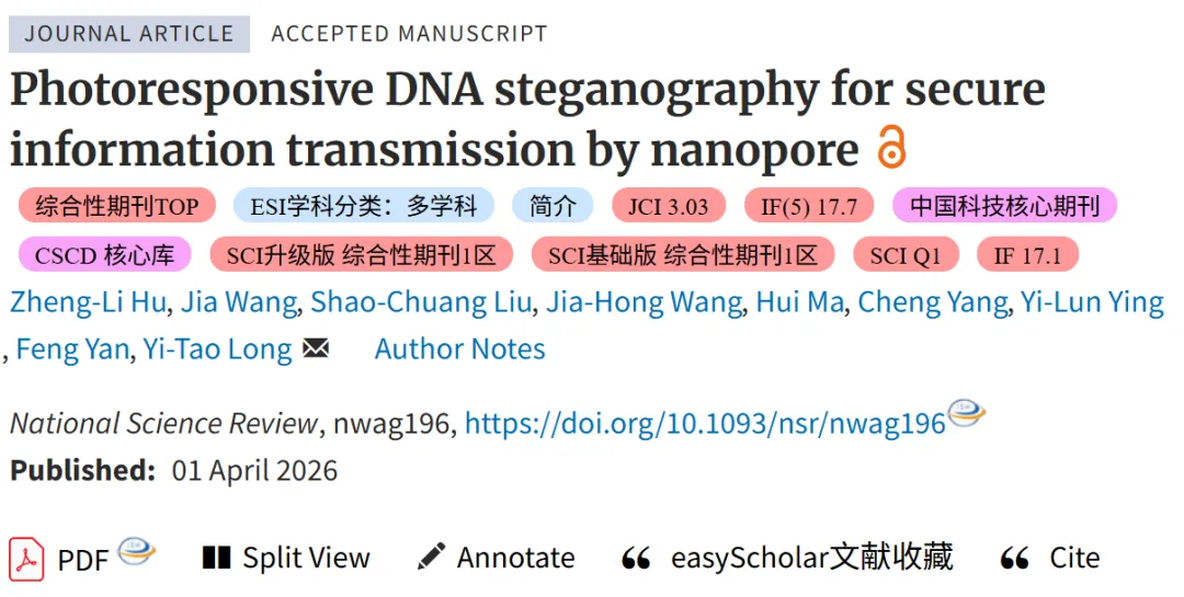 就在2026年4月1日,来自南京大学的龙亿涛团队在 National Science Review [IF 17.1] 提出了一种基于纳米孔的光响应 DNA 信息隐写系统,文章题为:“Photoresponsive DNA steganography for secure information transmission by nanopore”。