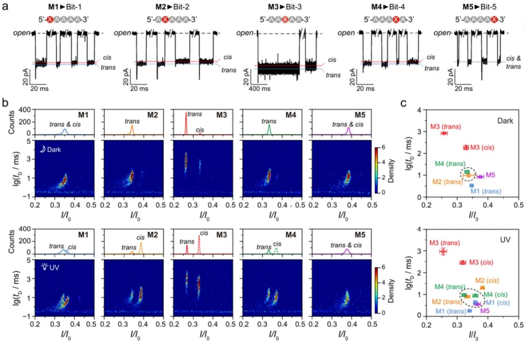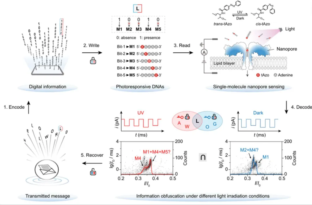 图 1:基于纳米孔的光响应 DNA 信息隐写系统工作流程。图 a 展示从文本到 5 位编码的数字化映射;图中部给出字母 L 对应的写入示意,Bit-1 和 Bit-4 置为 1,因此由 M1 与 M4 共同表示;右侧示意气溶素纳米孔对光响应 DNA 混合物的单分子读取,暗态与紫外照射后形成不同电流谱;下方分别展示两种密钥条件下的混淆输出集合,暗态可得到 G、L、O,紫外条件可得到 A、L、W,最终通过取交集恢复真实字符 L。整个流程涵盖编码、写入、读取、解码与恢复 5 个阶段,强调无需额外非编码链,而是通过光照开关实现信息隐写。随后,研究进一步设计了 5 条修饰位点不同的光响应 DNA,并利用气溶素纳米孔解析其单分子电流特征。结果显示,不同分子在暗态和紫外照射后会表现出互补性的可分辨规律,其中 M3 在两种条件下都最易识别,而 M2、M4 或 M1、M5 则分别在不同条件下形成混淆。正是这种照前与照后识别能力的差异,使单次读出只能得到带有歧义的候选集合,而双条件联合分析才能完成唯一判定,也由此奠定了体系的加密基础。