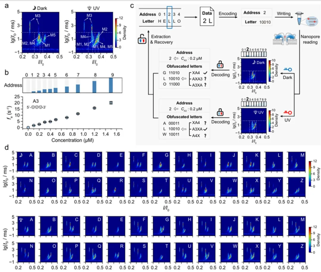 图 3:利用光响应 DNA 实现纳米孔辅助信息存储与加密。图 a 给出 5 种纯 DNA 信号在紫外照射前后预混后的二维密度散点图,并以虚线标出持续时间与残余电流阻断阈值,用于划分 M1 到 M5 的识别区域;图 b 展示 A3 在不同浓度下的有效频率 fe 与地址码 0 到 9 的对应关系,说明地址信息可通过事件频率定量读出;图 c 以地址化字符 2L 为例,示意从 Address 2 与 Letter 10010 的联合写入,到暗态和紫外态分别解码,再通过求交集实现恢复的全过程;图 d 则汇总展示 26 个英文字母在照前与照后条件下的二维密度散点特征图,说明整个字母表均可纳入该隐写系统。最后,研究以 HELLO WORLD 的传输作为概念验证,检验该体系在真实通信情境中的可行性。结果表明,只掌握暗态密钥或紫外密钥的拦截者都无法唯一恢复消息,因为不同位置会出现多重分子归属和大量伪解组合;而同时掌握两把密钥并采用联合恢复策略的接收者,则能够准确提取每个位置的共同输出并还原完整文本。与此同时,这一体系还表现出较高逻辑存储密度和较快读出效率,显示出面向安全即时通信的实际应用潜力。