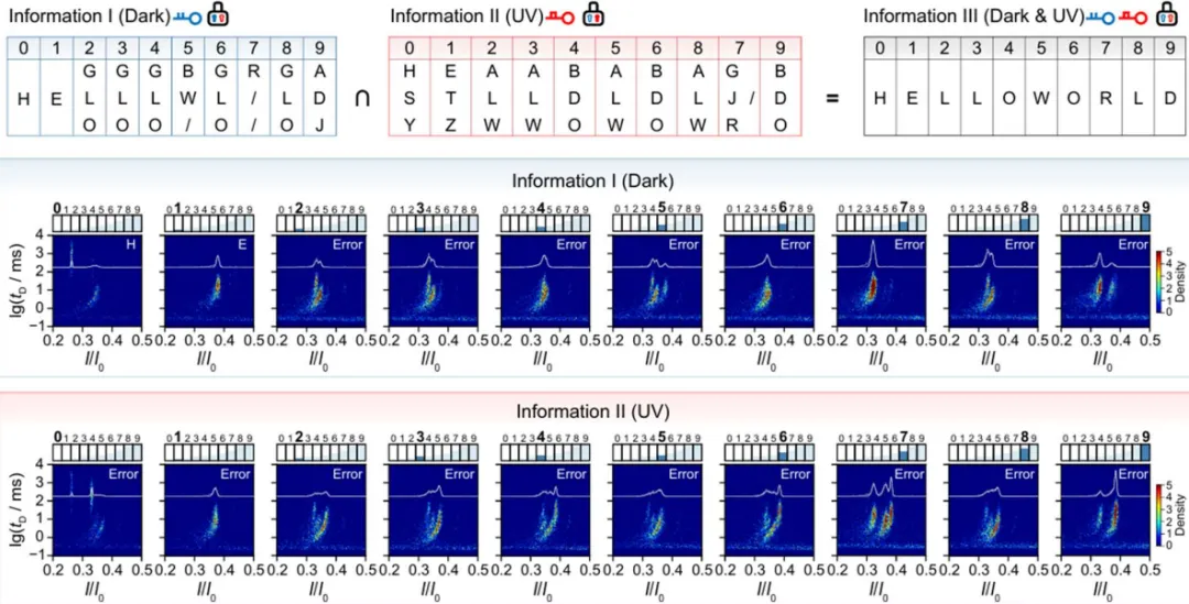 图 4:利用 NAPDISS 实现秘密消息传输。图 a 展示 10 字母消息在两种密钥条件下的解密结果与最终恢复结果,Information I 对应暗态 key I,Information II 对应紫外 key II,Information III 则表示双钥联合后的真实输出;上方表格按地址 0 到 9 排列各位置字符,下方分别给出各 DNA 混合物在两种条件下对应的二维密度散点图。多个位置在单钥条件下只能得到 Error 或多候选结果,而在双钥联合后恢复出 HELLOWORLD,直观体现出系统对拦截者的混淆能力与对合法接收者的可恢复性。总结