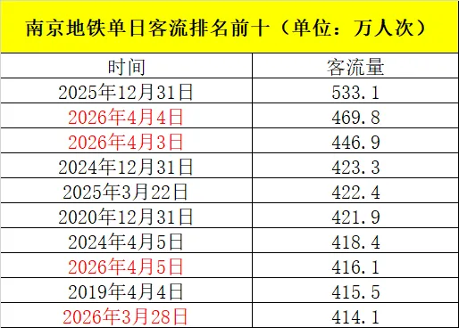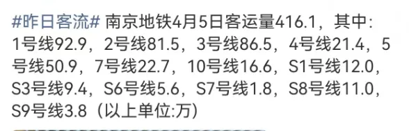 根据南京地铁刚刚发布的客流数据,4月5日,南京地铁客运量416.1万人次,再次打破纪录,位居历史第8!