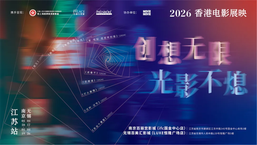 2026年4月10日至4月26日,香港特别行政区政府驻上海经济贸易办事处携手南京百丽宫影城(ifc国金中心店)、无锡百美汇影城(LUXE恒隆广场店),特别呈现“创想无限,光影不熄——2026香港电影展映”活动,将带来10部具有代表性的当代香港影像,以期为观众提供洞察香港社会百态与人文精神的多元视角,探寻香港电影在现实关怀与类型探索中的发展轨迹。