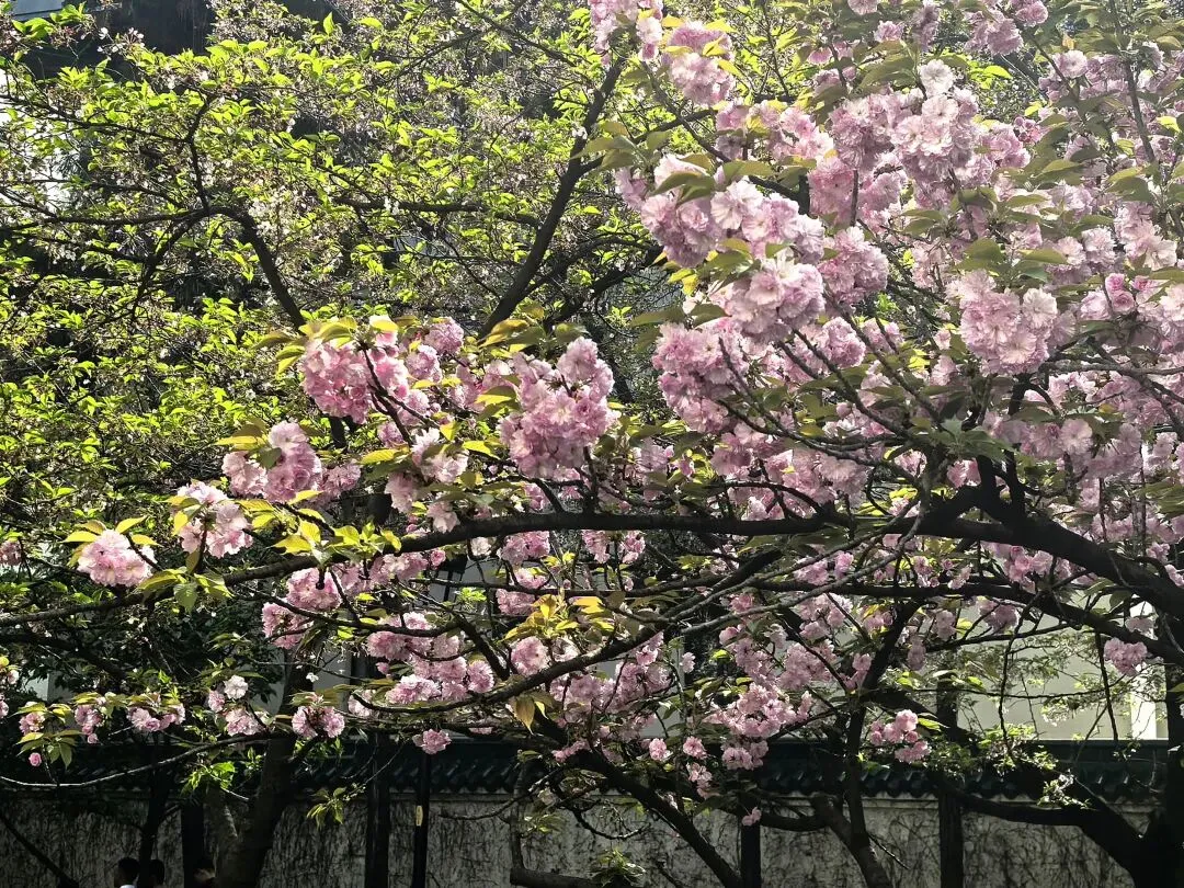 缘分本就稀薄寡淡,我向来是不信半点佛祖保佑所得皆所愿之类的,当然古鸡鸣寺也没有影响我的看法,倒是解惑了原先听到的不同版本传闻:扶正斩孽,单来则寡,求财送子?答案是有而不全,善德为重。绕乐师佛塔缓慢的三周里,遗憾地没有做到心诚则灵,或许我还太年轻(这话听起来多让人气愤啊),还觉得自己可以改变所想改变的,不到解释“命”那一步吧。所以当敬香的细烟袅袅飘升,意识的关注点流动到黄墙砖瓦旁的樱花,此刻只有叠瓣的晚樱是开得最盛的,枝根交融,一颗颗小花球。反观白樱已经开始落了,用凋零的牺牲铺出春姑娘到来的花瓣舞台。