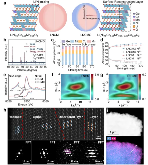 在这项研究中,研究人员提出了一种双梯度设计策略,在颗粒水平上整合成分梯度和结构梯度的互补优势,以实现卓越的电化学性能。具体而言,在LiNi₀.₉₀Co₀.₀₅Mn₀.₀₅O₂正极中引入锗(Ge)梯度;颗粒表面较高的Ge浓度促进无序岩盐/尖晶石混合相梯度层的形成,而体相中微量Ge掺杂稳定了层状结构,实现了从表面无序岩盐相到尖晶石相再到层状相的连续相演化。这种梯度结构将钝化的岩盐相与三维尖晶石骨架相结合,通过调控Ni氧化还原态解决界面降解问题,同时建立高效的锂离子扩散通道,共同实现优异的倍率性能和循环性能。此外,强Ge-O键的引入进一步增强了体相晶格内的结构稳定性,有效缓解了不可逆相变、各向异性应变积累和氧损失。X射线光电子能谱深度剖析显示,Ge在表面富集(4.007 at.%),显著高于名义设计的1 at.%,而在30-240 s刻蚀时间内Ge含量波动在约1 at.%,570 s后降至0.962 at.%,呈现典型的浓度梯度分布。优化的正极在10 C倍率(4.3 V)下提供171.4 mAh·g⁻¹的高比容量,在1 C下200次循环后保持182.9 mAh·g⁻¹(容量保持率97.0%),在苛刻条件(4.55 V,45和55°C)下仍保持稳定性能。