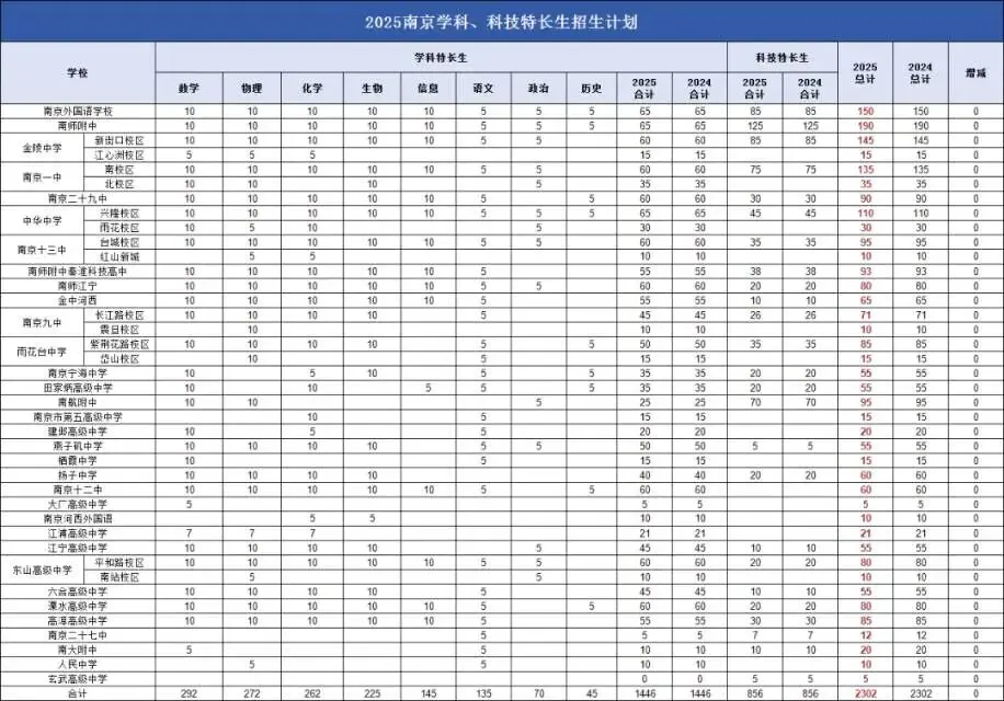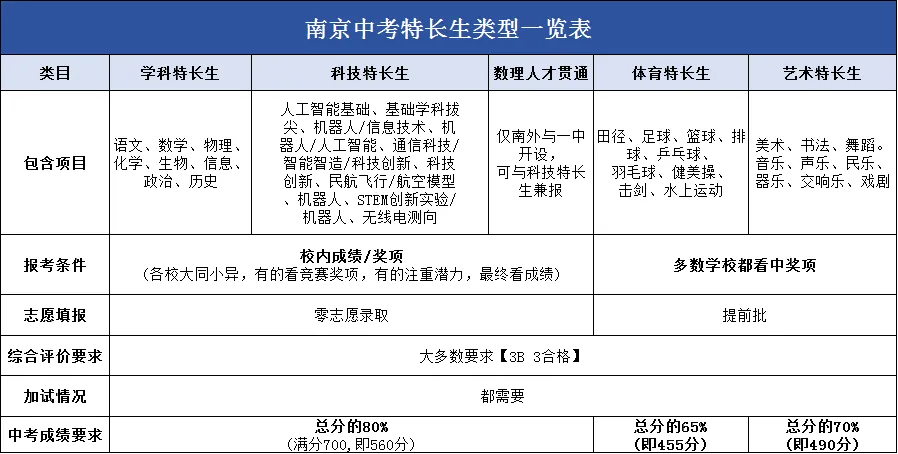 南外、附中、二十九中、雨花台中学等多所顶尖高中都有特长生单独编班,或者编入好班的政策。单独编班的特长生相对会拥有更好的师资,有一套培养计划(有学校特长生班会提早开学,提前学完校内知识以应对竞赛需求,也有部分学校的特长生在新高一暑期安排了研学活动),并且特长生相对一般中考的孩子有更大机会进入“竞赛班”、“重点班”。