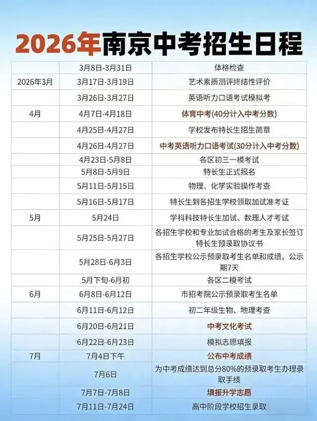 *注:另有数理人才贯通项目80人,南外20校内+20校外,一中40人最后附上2026年中考时间轴(时间根据25年预测,仅供参考,最终以官方公布为准)