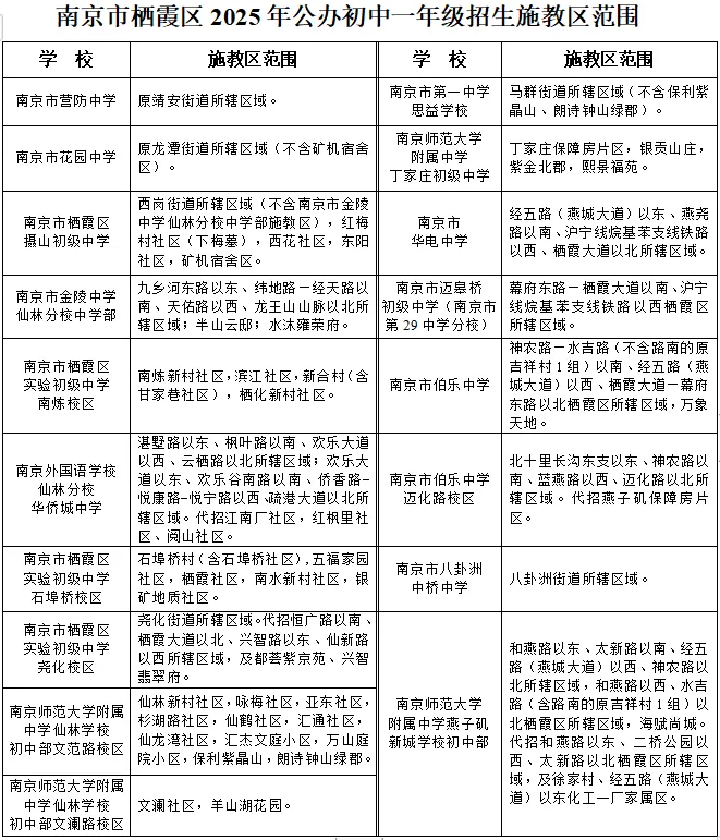 注:2025年六合区义务教育阶段学校招生,南京市科利华中学棠城分校施教区内的适龄少年可选择到南京师范大学附属六合实验中学就读。