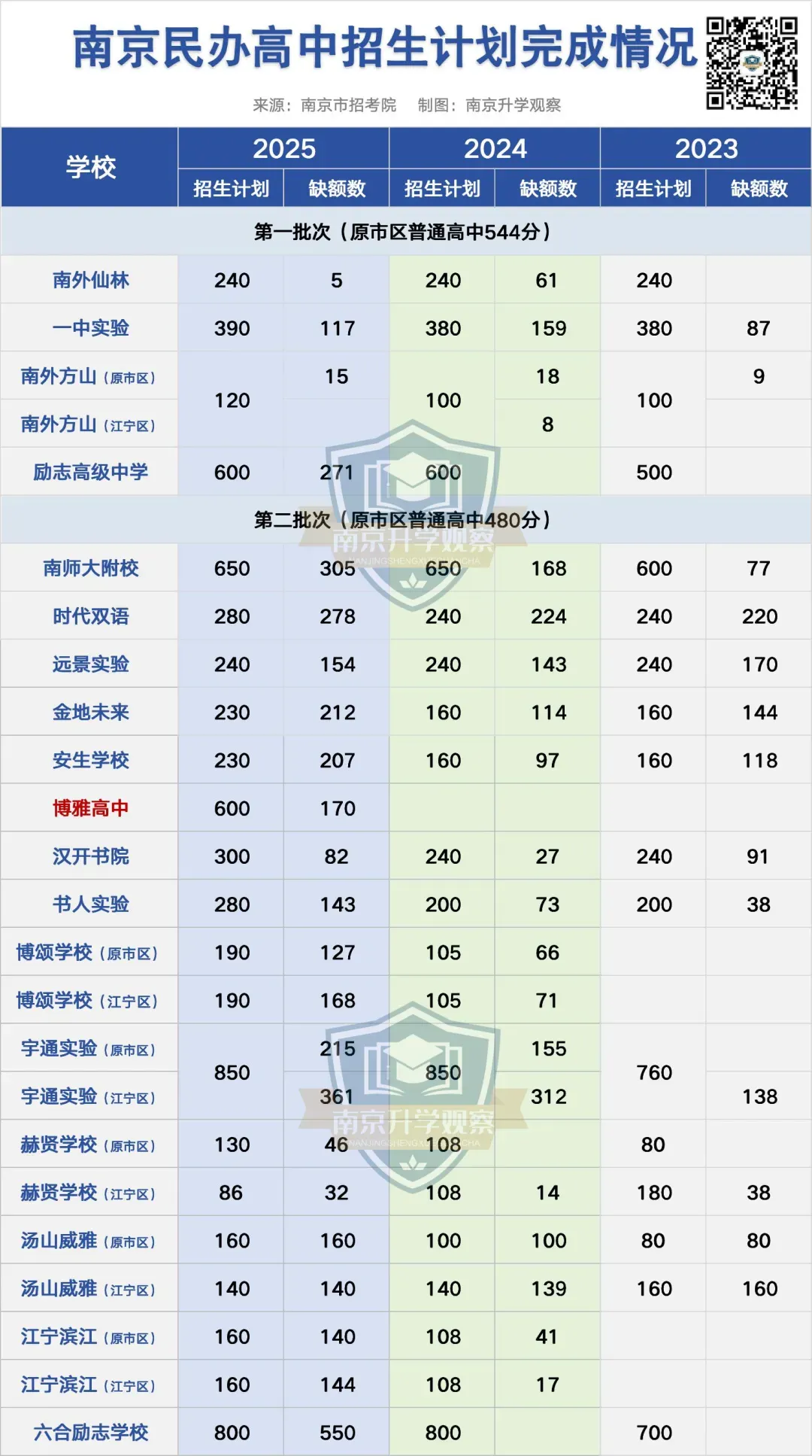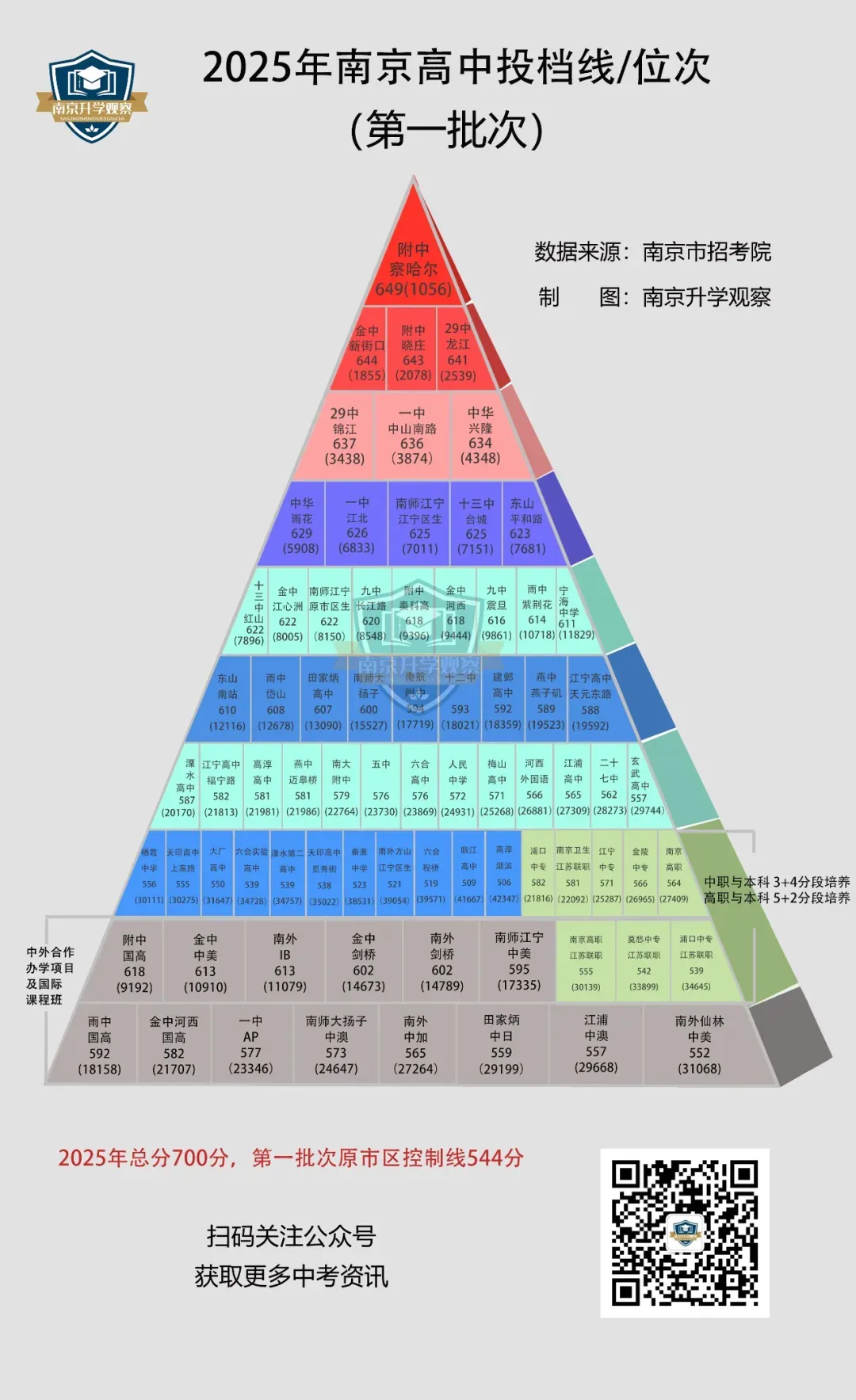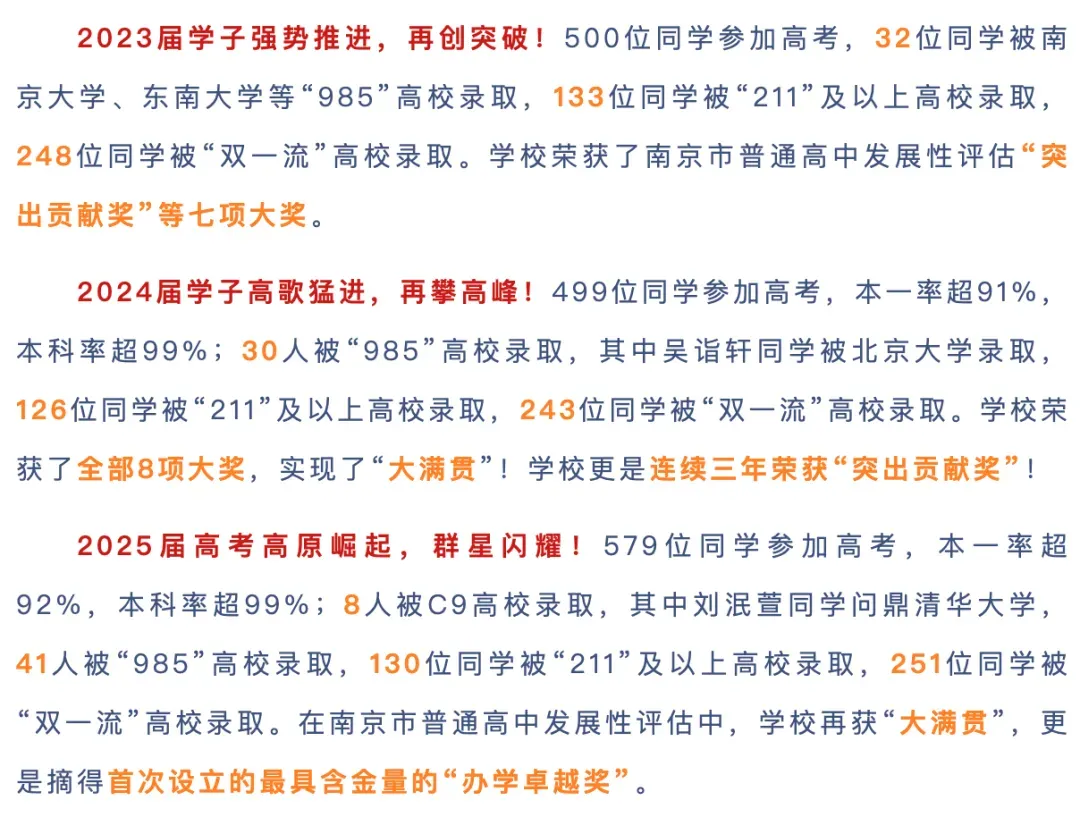 之前,因为种种原因,南京各高中的招生动作被摁下了暂停键,不准提前摸底生源,也不准任何形式的线下活动。然而,暂停键每年都摁,可摁住的只是动作,摁不住的是每年都在翻新的中招格局。先说讨论声很高的附中江北,在官宣今年就启用,由秦科高原执行校长徐国民挂帅后,附中新校区的期待算是落空了,投档线和位次不太可能会超过一中北(投档线626分,位次6833)了。回顾秦科高的起点,由南京市教育局、秦淮区人民政府和南京师范大学附属中学合作共建,江苏省第一所以“科技”冠名的普通高中,是“南师附中办学联合体”的一员。2019年正式招生,招生计划400人,第一年投档线就达到了600分。更值得注意的是,秦科高第一年招生就是面向全市招生,那时面向全市招生的仅有南外、附中、金中、一中、中华、29中、13中、秦科高。一开始的师资大致有58人,其中,中学高级教师及以上,34人,占60%;市级学科带头人、优秀青年教师及以上,17人,占26%;省市级表彰、获奖,27人,占47%;大市级以上表彰教师,45人,占78%;获区级以上表彰,100%。从这些就能看出,秦科高一开始就被赋予了较高定位,校长由附中掌门人兼任,办学资源与附中本部深度绑定,更像是附中主动建了个分身,独立招生,去挑战南京稳固已久的六大格局。在江北,除了一中北之外,排在第二的就是南师大扬子了,只不过一中北(投档线626分)和扬子(投档线600分)之间隔着26分。这也是这么多年,江北留不下好生源的关键原因之一,高分学生在江北选择有限,好在江北的教育壁垒没有江宁高,还是能填报江南高中。顺便提一句,不知道江北新区和浦口一体化后,今年中考志愿填报会不会有变化。南师大扬子是由扬子石化集团于1984年创办,1988年与南京师范大学联合办学,原隶属于扬子石化职工子女总校,2004年10月划归地方教育部门,是一所四星高中。南师大扬子的江湖地位,是基于当年大厂的高光时刻,生源主要都是在江北。海安至强985班的高考成绩还是不错的,2025年均分629分,全员达985线,成绩不俗。所以,当附中江北加入战局后,南师大扬子的危机感恐怕是最大的,特别是从地理位置来说,附中江北更具优势,并且第一年招生江北必然会大力扶持附中江北,难道指望江南生源占据大头嘛?还有人认为,附中江北会是第二个南师江宁,但两者的办学属性和招生模式大相径庭,没法直接对标。再说科学高中。