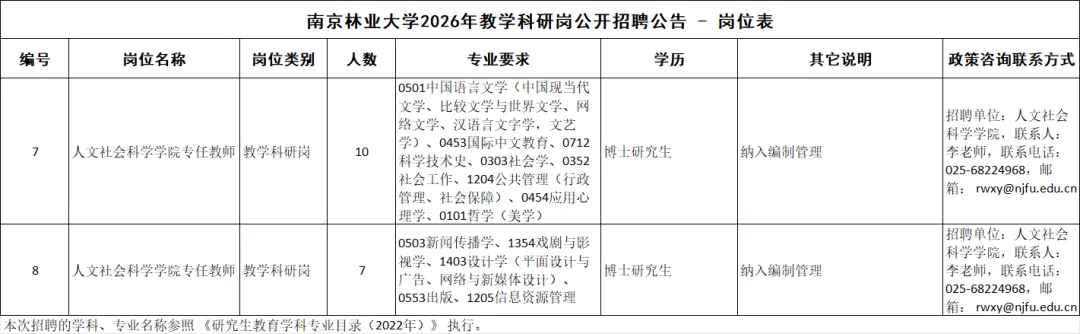 南京林业大学人事处负责回答此次招聘政策咨询。