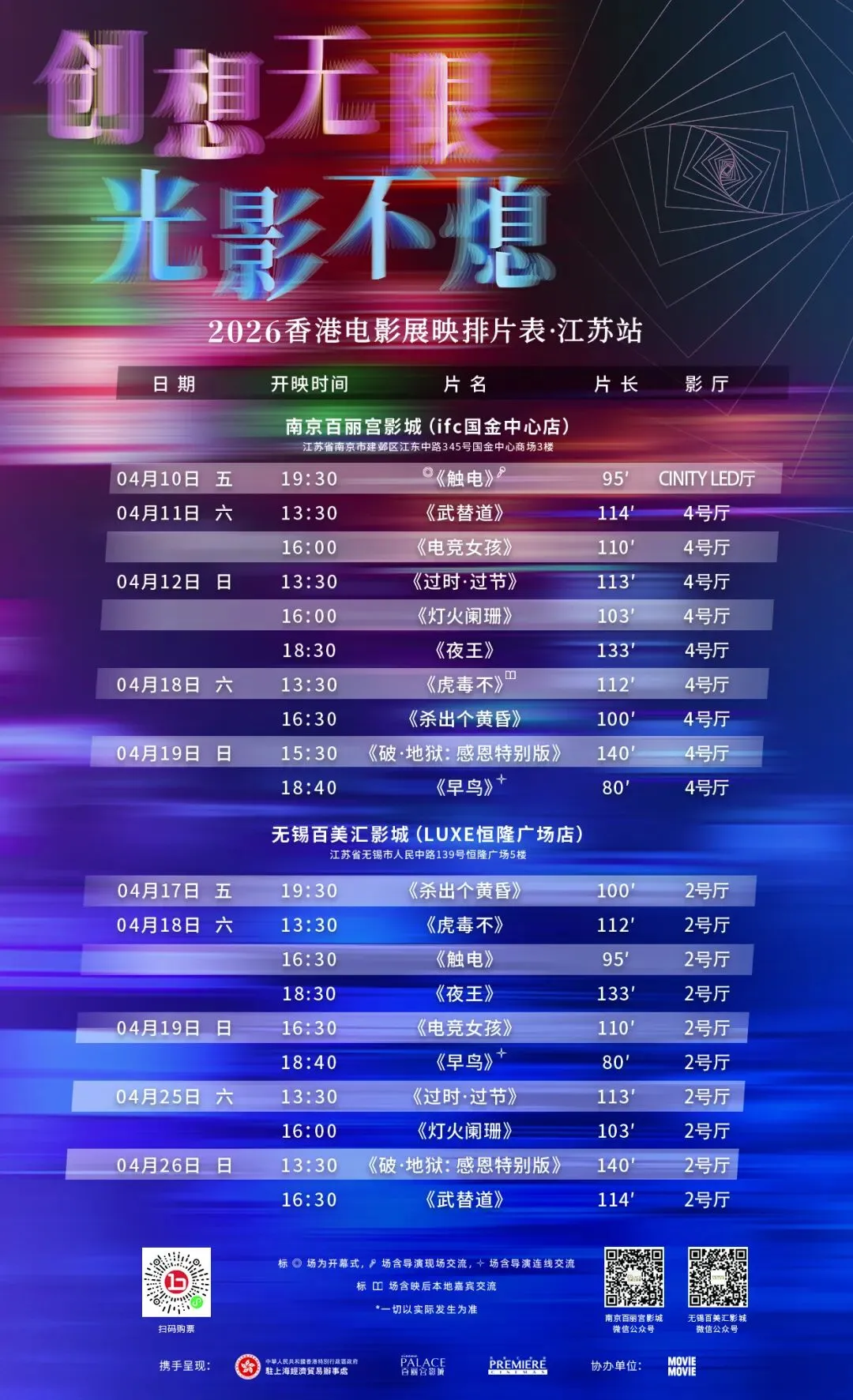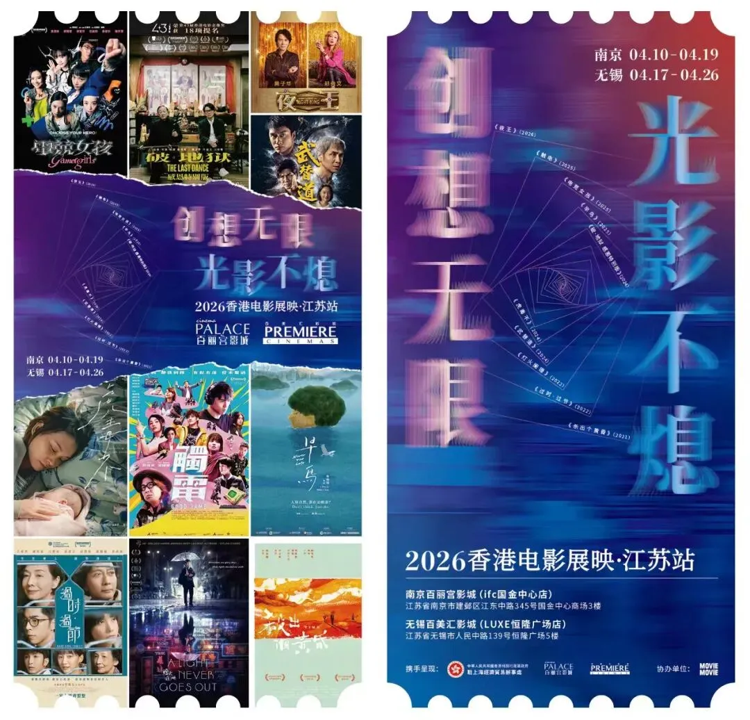 2026年4月10日至4月26日,香港特别行政区政府驻上海经济贸易办事处携手南京百丽宫影城(ifc国金中心店)、无锡百美汇影城(LUXE恒隆广场店),特别呈现“创想无限,光影不熄——2026香港电影展映”活动,将带来10部具有代表性的当代香港影像,以期为观众提供洞察香港社会百态与人文精神的多元视角,探寻香港电影在现实关怀与类型探索中的发展轨迹。
