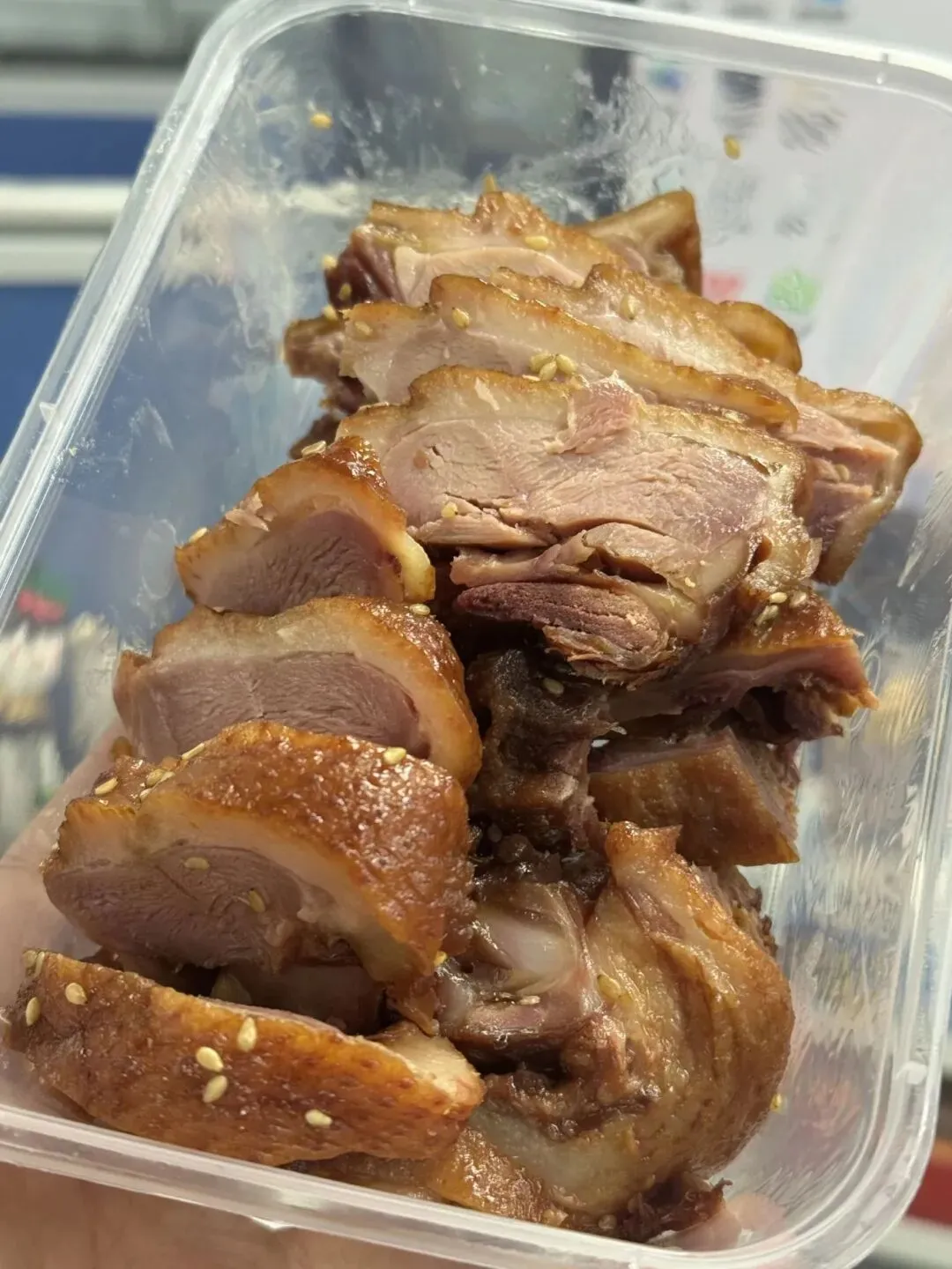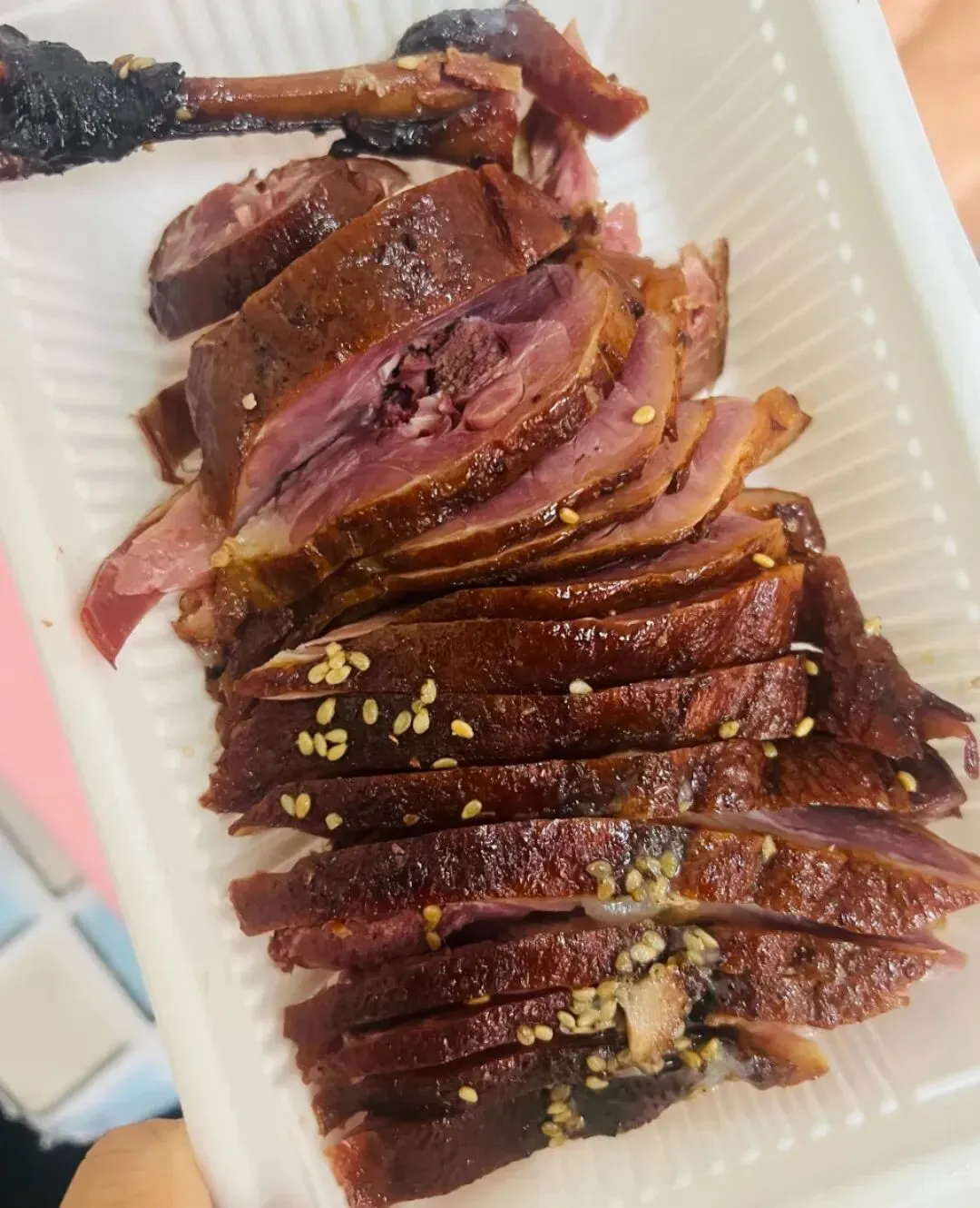 章云的酱板鸭,酱色透亮,颜色比较深。皮脆微甜,肉质紧实不柴,骨头酥软可嚼,带有芝麻香与卤汁的复合香气。甜咸比例平衡,咸鲜回甘,咬一口满嘴卤香,越嚼越有味。