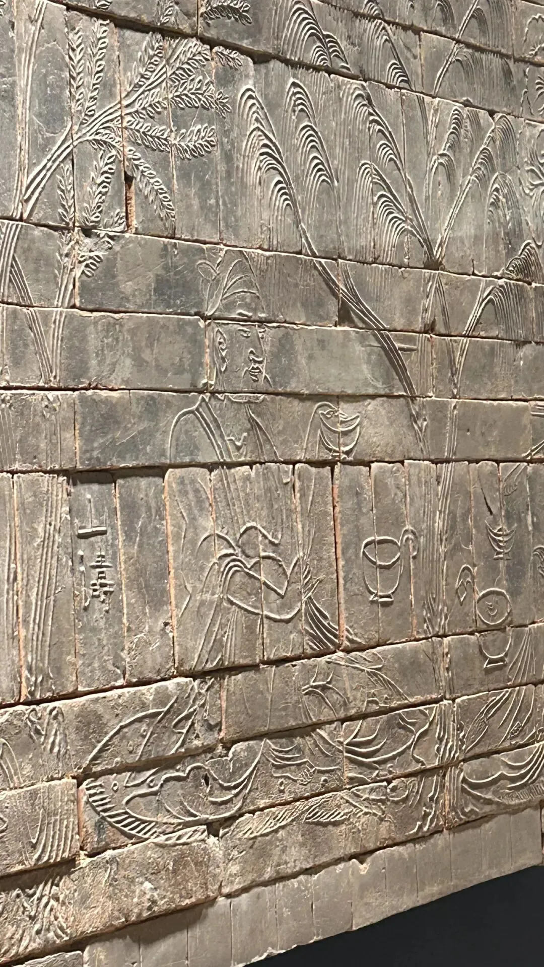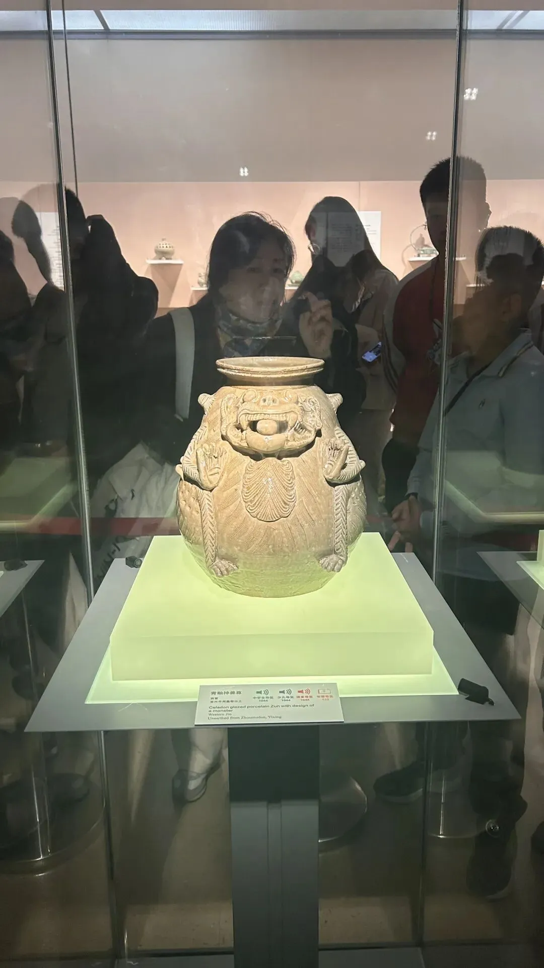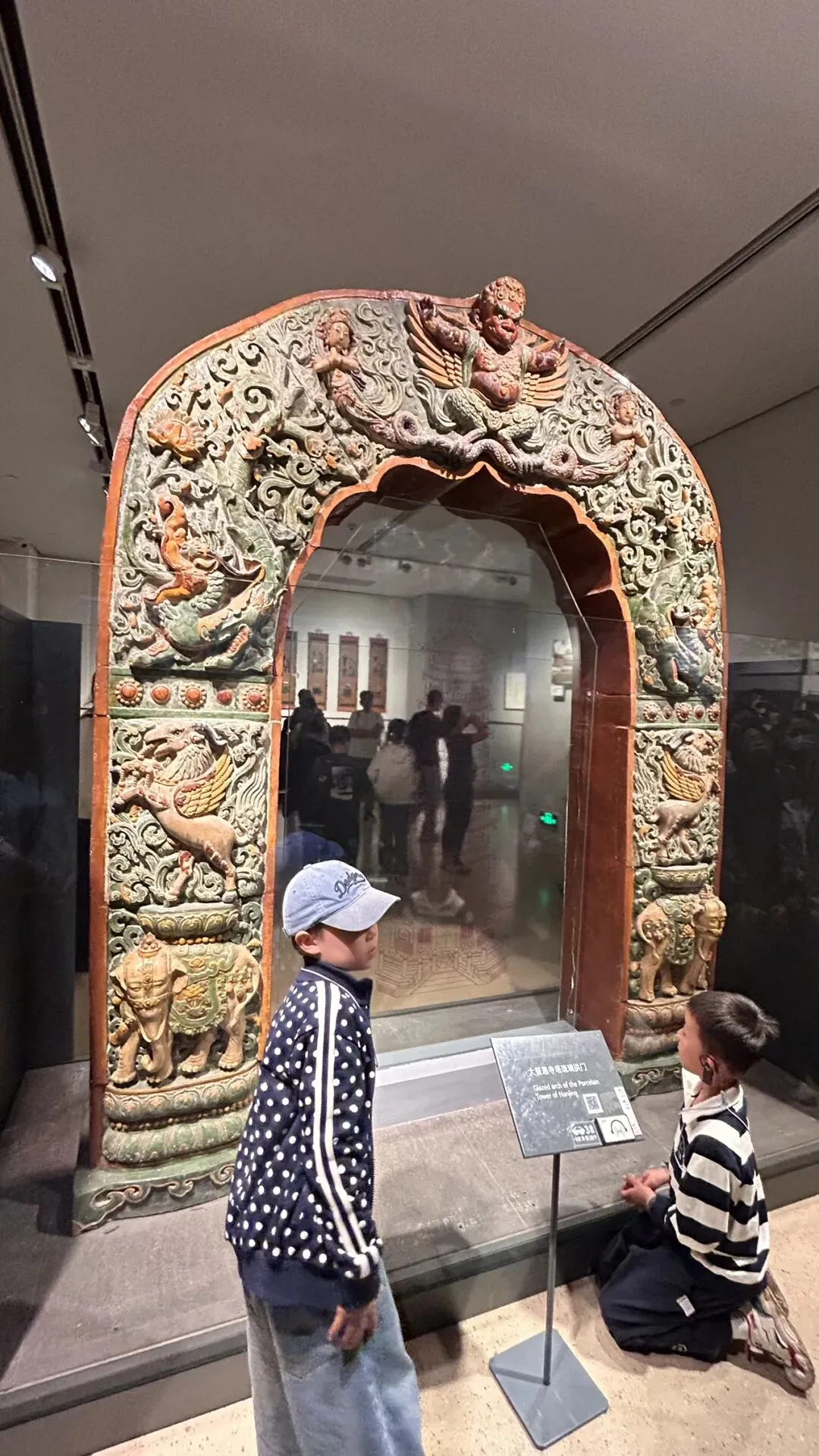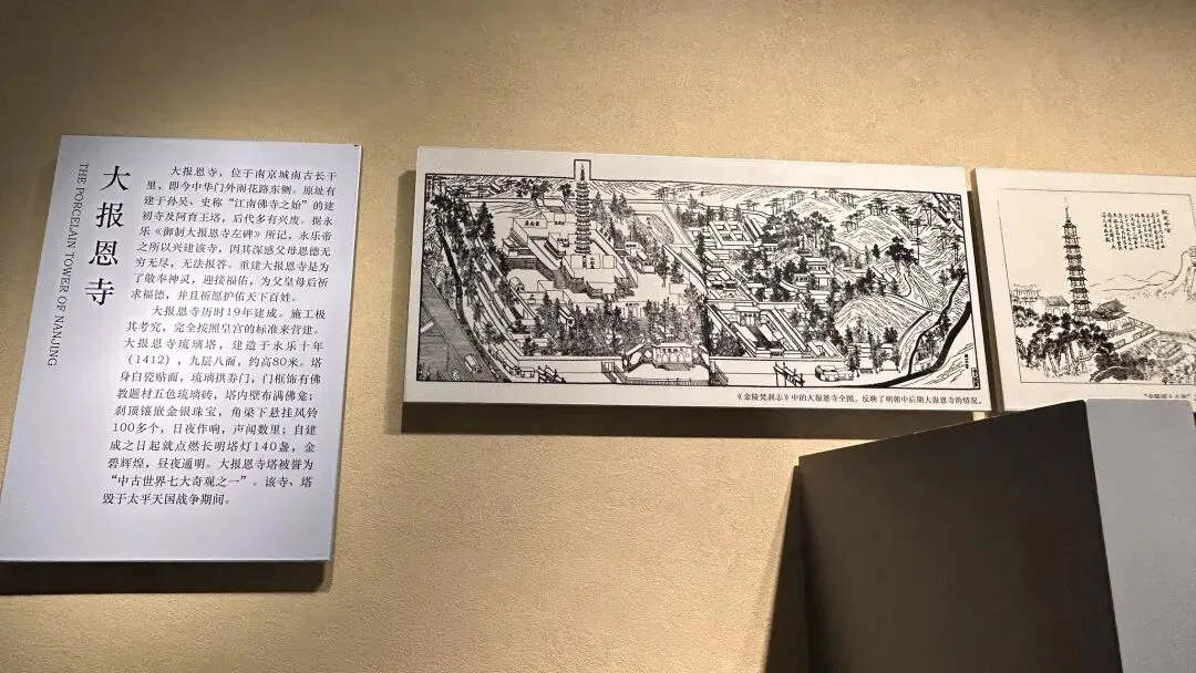 二是东汉错银铜牛灯,青铜器,设计绝妙,在牛首上连一弯管与灯体相接,是烟道又是灯把手,一举两得。 牛腹中空,圆形带柄灯盘上有可转动的屏板,并通体以错金银工艺装饰流云纹等纹饰。可惜,当天只展出了仿制品。 三是西晋青釉神兽尊,是南京博物院十件国宝级文物之一。盘口短颈,削肩鼓腹,浮雕神兽一只。 面目狰狞的神兽纹饰“张牙舞爪”,威风八面,象要将一切凶险和邪气驱离主人。西晋青釉神兽尊的妙处,在于“尊”与“兽”的浑然一体。南朝竹林七贤与荣启期砖画,8人席地而坐,各具神态,填补了六朝绘画稀有传世真迹的空白,在中国绘画史上具有非常重要的地位。 嵇康,头梳双髻,双手弹琴,赤足坐于豹皮褥上。山涛头裹巾,一手挽袖,一手执耳杯欲饮。导游说,时处纷争不息、动荡不安朝代的士人阶层,傲慢颓废,却有高义之风,让小朋友多读读《世说新语》。 五是大报恩寺琉璃塔拱门,高78米,九层八面,历时19年建成,通体琉璃结构体现明代建筑技艺顶峰,被誉为“中古世界七大奇观”之一。 17世纪荷兰人纽霍夫游记与安徒生童话《天国花园》均记载琉璃塔盛况。“东风”向风妈妈说:“我刚从中国来——我在瓷塔周围跳了一阵舞,把所有的钟都弄得叮当叮当地响起来!”