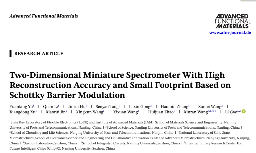 本工作室建立了微信群促进同学们之间的交流学习并有效讨论问题,可通过添加编辑微信进群。1.编辑微信:1)FEtunan(微信号)2)186006489282.工作室提供:二维材料生长及器件制作;科研绘图技巧;二维相关报告或会议推送;二维读博导师推荐、课题组招聘需求等欢迎大家投递中文的工作宣传稿及广告,具体联系微信:FEtunan(微信号)南京邮电大学高丽教授等人发表题为 “Two-Dimensional Miniature Spectrometer With High Reconstruction Accuracy and Small Footprint Based on Schottky Barrier Modulation ”于 Advanced Functional Materials 上