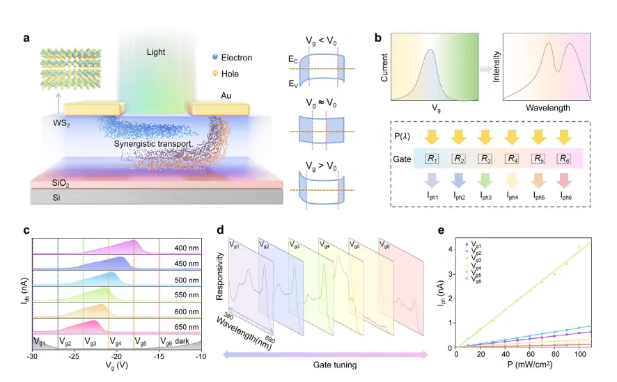 在光照下,WS2层内产生大量电子-空穴对。通过调节栅极电压(Vg),可以动态调制肖特基势垒高度,从而改变电子和空穴的传输特性,实现波长依赖的反双极性光响应。这种响应特性为光谱重构提供了物理基础。