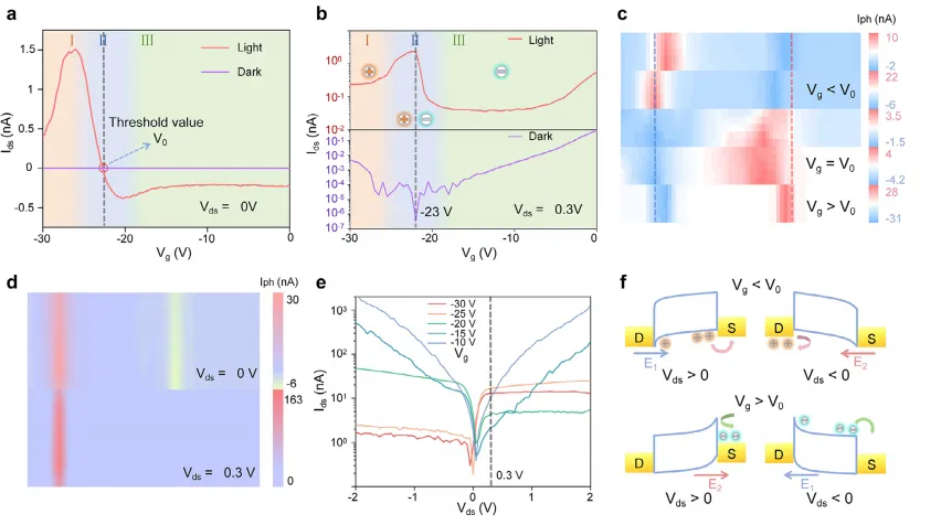 图2深入探讨了栅极电压对肖特基结的调制机制。图2a展示了在零源漏偏压(Vds=0V)下,转移曲线随光照和黑暗条件的变化,显示了光电流极性的反转和栅极电压的依赖性。图2b为对数坐标下的转移特性曲线,定义了三个不同的传导区域:空穴主导区、混合传输区和电子主导区。图2c和图2d分别为空间分辨光电流映射图,在Vds=0V和Vds=0.3V下,光电流主要产生于接触界面,验证了背靠背肖特基结的形成。图2e和图2f进一步通过输出特性和能带图解释了栅极电压调制光响应的机制,展示了栅极电压如何改变费米能级位置,从而影响载流子传输和光电流响应。