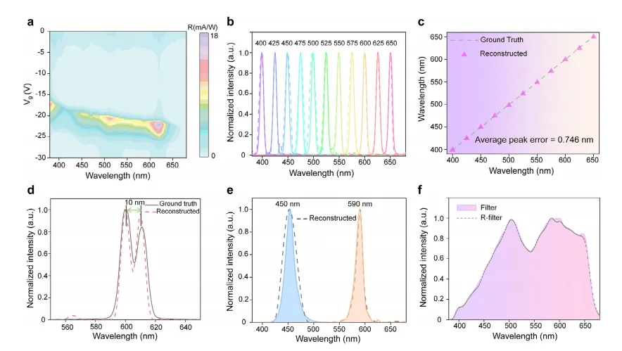 图3展示了光谱仪的光谱重构性能。图3a为设备的光谱响应矩阵R(λ, Vg)的三维图,显示了波长和栅极电压对光谱响应的非线性影响。图3b比较了窄带光源的实际发射谱和重构谱,显示了重构谱与商业光谱仪(Ocean Optics QE65Pro)测量结果的高度一致性。图3c总结了重构峰波长的误差分布,平均绝对误差为0.746nm。图3d展示了光谱分辨率的评估结果,证明了设备在可见光范围内具有优于10nm的光谱分辨率。图3e和图3f分别展示了LED和宽带光源的光谱重构结果,进一步验证了设备在宽波长范围内的准确性和稳定性。