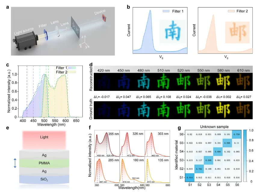 图4展示了光谱仪在高光谱成像和材料分类中的应用。图4a为空间扫描高光谱成像系统的示意图,通过两阶段扫描策略实现目标光谱特征的空间分辨成像。图4b展示了代表性像素的光电流随栅极电压的变化,用于确定目标光谱特征的最佳响应栅极电压。图4c和图4d分别展示了在不同光照条件下,重构光谱与参考光谱的比较以及成像结果的对比,证明了光谱仪在高光谱成像中的有效性。图4e至图4g展示了材料分类演示的结果,通过计算重构光谱与参考光谱的相似度,实现了对六种不同厚度PMMA样品的准确分类,平均分类准确率达到70.3%。