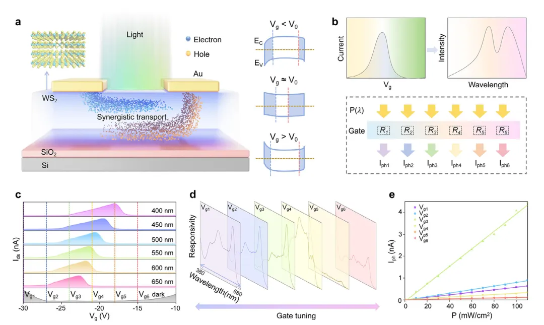 图1 基于单一材料的肖特基结光谱仪工作原理。(a)栅压可调的Au-WS₂-Au肖特基结器件示意图。蓝色和黄色球体分别代表电子和空穴。右图插图为通过改变栅极电压动态调制Au-WS₂肖特基势垒。左上插图为WS₂材料的原子结构图。(b)肖特基结光谱仪的工作流程。预先标定光谱响应度矩阵后,通过测量光电流响应并求解线性方程,重建未知光谱。(c)不同波长下的转移特性曲线(Vds = 0.3 V),显示出明显的反双极输运行为以及峰值位置的移动。(d)光谱响应度(R)随波长(380–680 nm)和栅极电压的变化关系,呈现出显著的非线性特性。(e)在635 nm波长下,不同栅极电压时光电流(Iph)与入射光功率密度(Pin)之间的线性依赖关系。