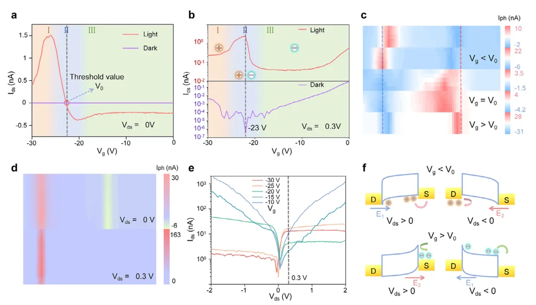 图2 肖特基结器件中的栅压调制机制。(a)Vds = 0 V时的转移曲线。在V0处光电流极性反转表明空穴与电子输运达到平衡。(b)对数坐标下的转移特性曲线(Vds = 0.3 V),定义了三个区域:I区(空穴主导)、II区(集体输运)、III区(电子主导)。反双极峰与暗电流最小值位置重合。(c)空间分辨的光电流分布图(Vds = 0 V)。电流仅产生于接触电极处,证实了背对背肖特基结的存在。(d)偏压依赖的光电流分布图(Vg = −30 V)。外加偏压增强了左侧接触处的电流(0.3 V),同时抑制了右侧接触处的电流。(e)输出特性曲线:整流极性反转(−25 V至−20 V)与反双极峰相关。虚线表示在0.3 V时Ids呈现非单调变化。(f)能带示意图。Vg调制费米能级(Ef),从而调控载流子输运的不对称性(WL > WR)以及区域之间的转变。