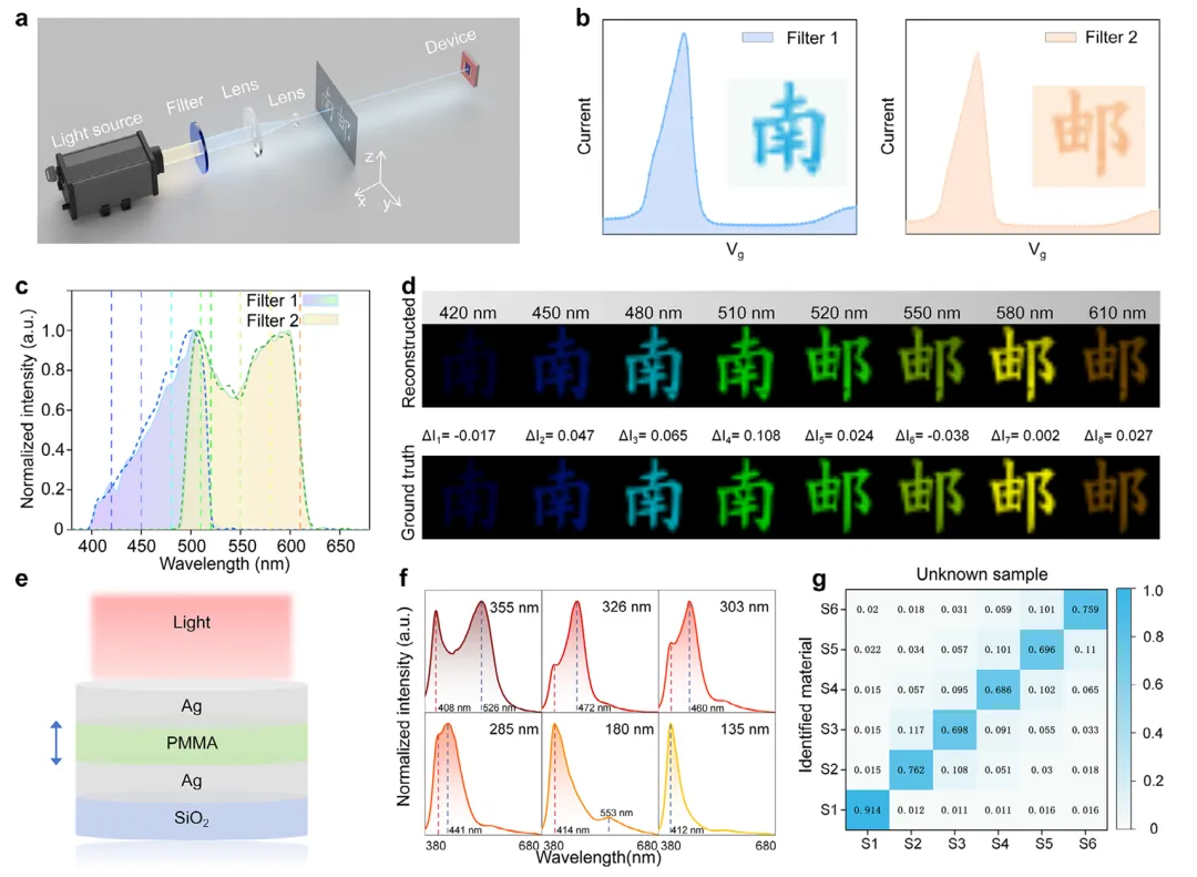 图4 用于材料识别与分类的高光谱成像。(a)空间扫描高光谱成像系统示意图。卤素灯发出的光经过带通滤光片后照射到字符图案掩模版(“南邮”)上。(b)扫描过程中代表性像素的光电流随栅极电压(Vg)的变化关系。(c)两种带通照明下的重建透射光谱(虚线:所选光谱波段)。(d)选定波段下本器件与商用光谱仪的成像结果对比。(e)样品结构(SiO₂/Ag/PMMA/Ag)以及通过旋涂法控制PMMA厚度(355–135 nm)。(f)不同厚度PMMA样品的参考透射光谱(波长范围:380–680 nm),由商用光谱仪测得。红色和蓝色虚线分别表示两类光谱特征峰。(g)基于光谱相似性分析(加权相关系数与光谱角)得到的混淆矩阵,利用重建光谱对六种材料实现了70.3%的分类准确率。