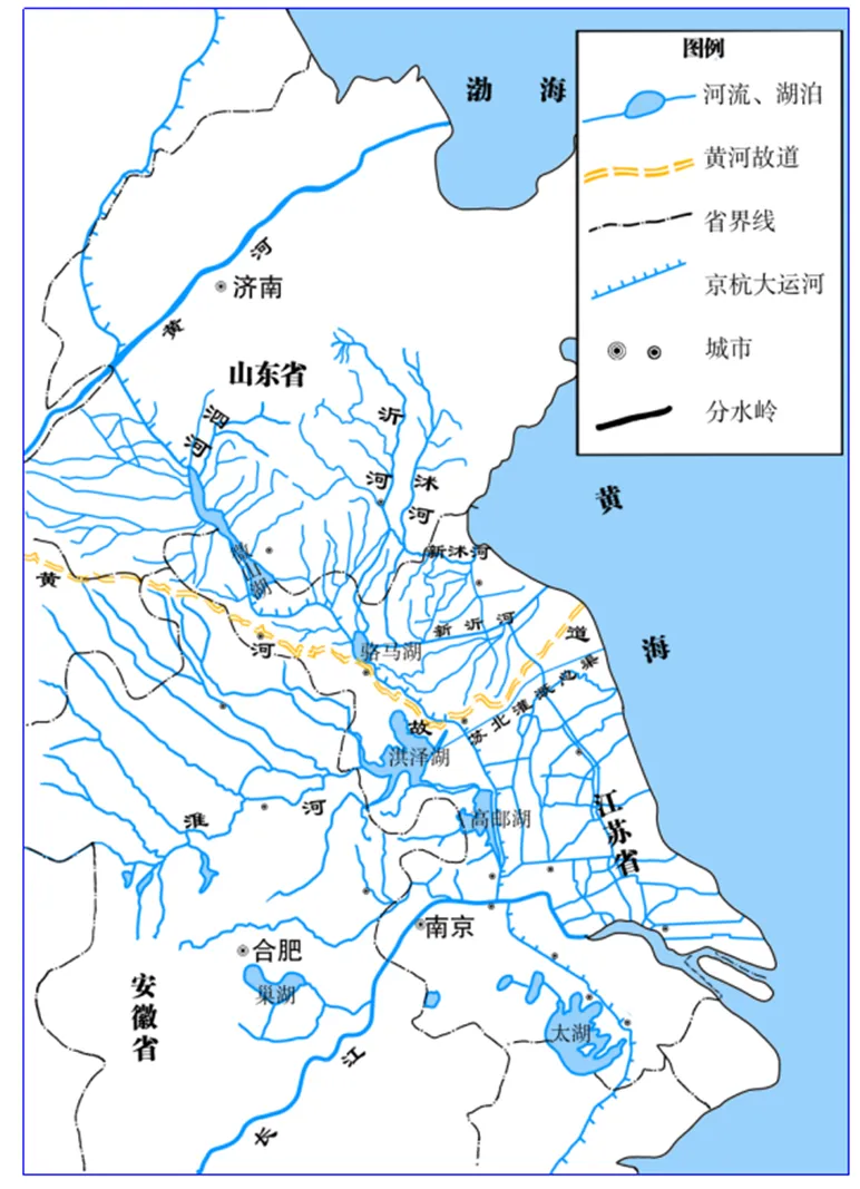 材料二:该中学生查阅文献资料发现:黄河长达700余年的夺淮历程,重塑了东部地区水系格局,推动了微山湖、骆马湖、洪泽湖等湖泊的形成发育。夺淮前,沂河、沭河经泗河汇入淮河后东流入海。1128年,黄河决口南泛夺淮入海,淮河和沂沭泗水系逐渐分离,1855年黄河北归后,河道淤塞造成的阻隔并未消除,使淮河水系与沂沭泗水系彻底分离,仅靠京杭大运河等人工水道相连。