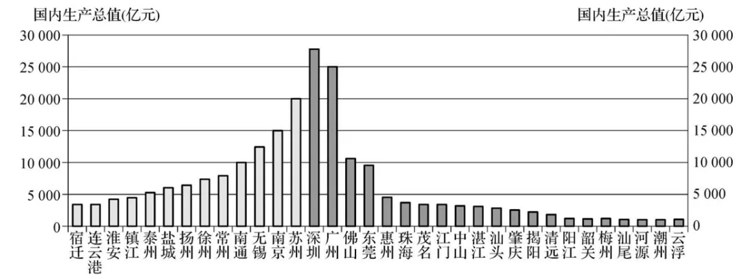 材料二:2020年,广东和江苏国内生产总值(GDP)居全国第一、第二位。下图为“2020年江苏和广东各地级市GDP统计图”。