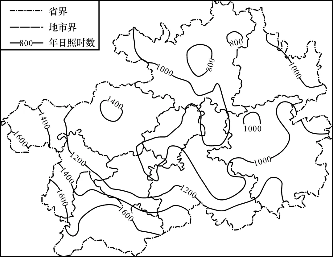材料二:如图为“贵州某年日照时数分布图”。
