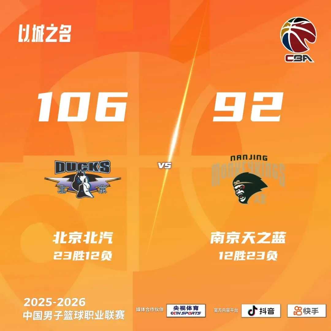 末节决战,帕克直杀篮下造成犯规两罚全中,陈盈骏同样命中两罚。方硕、麦基联手取分,球队暂停调整。帕克接连冲击篮筐造成杀伤罚球取分,陈盈骏回敬两罚。麦基上篮打进,翟晓川快攻上篮。马内克三分再中,郭昊文远投再造犯规三罚两中。赵柏清接昊文助攻错位打成2+1继续追分,北京队暂停调整。杰曼溜底攻框,赵柏清故技重施再度造成杀伤两罚中一。雷蒙接应三分,杰曼两罚中一。赵柏清两罚全中,陈盈骏上篮打进,郭昊文两罚中一。陈盈骏三分再中,球队叫出暂停。马内克二次进攻得分,雷蒙底角三分。郭昊文反击快速两分,周琦、杰曼两罚全中。时间走完,北京北汽106-92南京天之蓝。