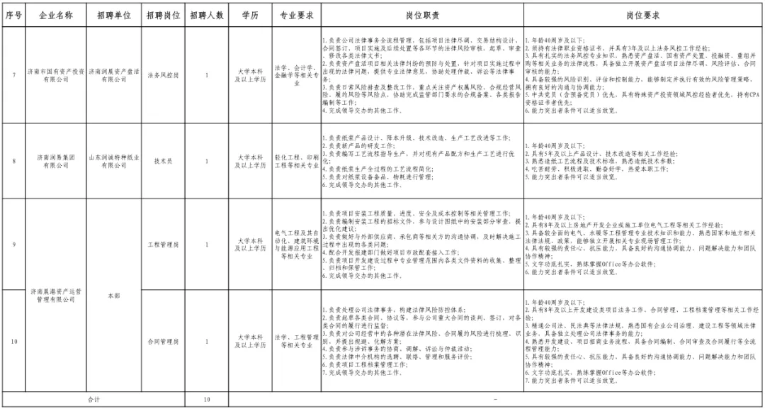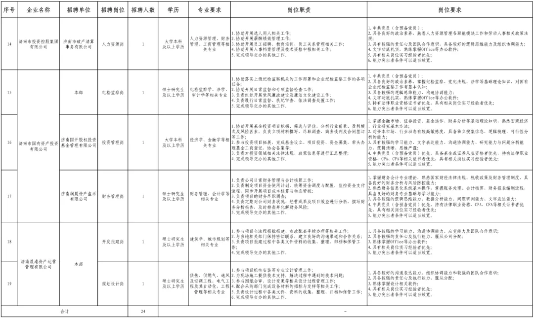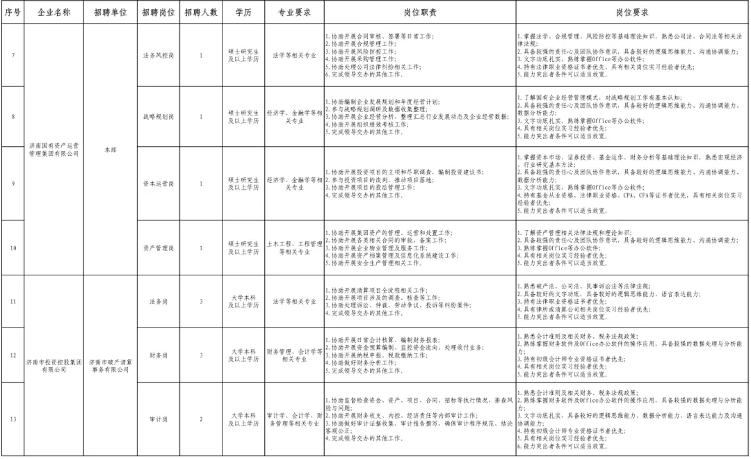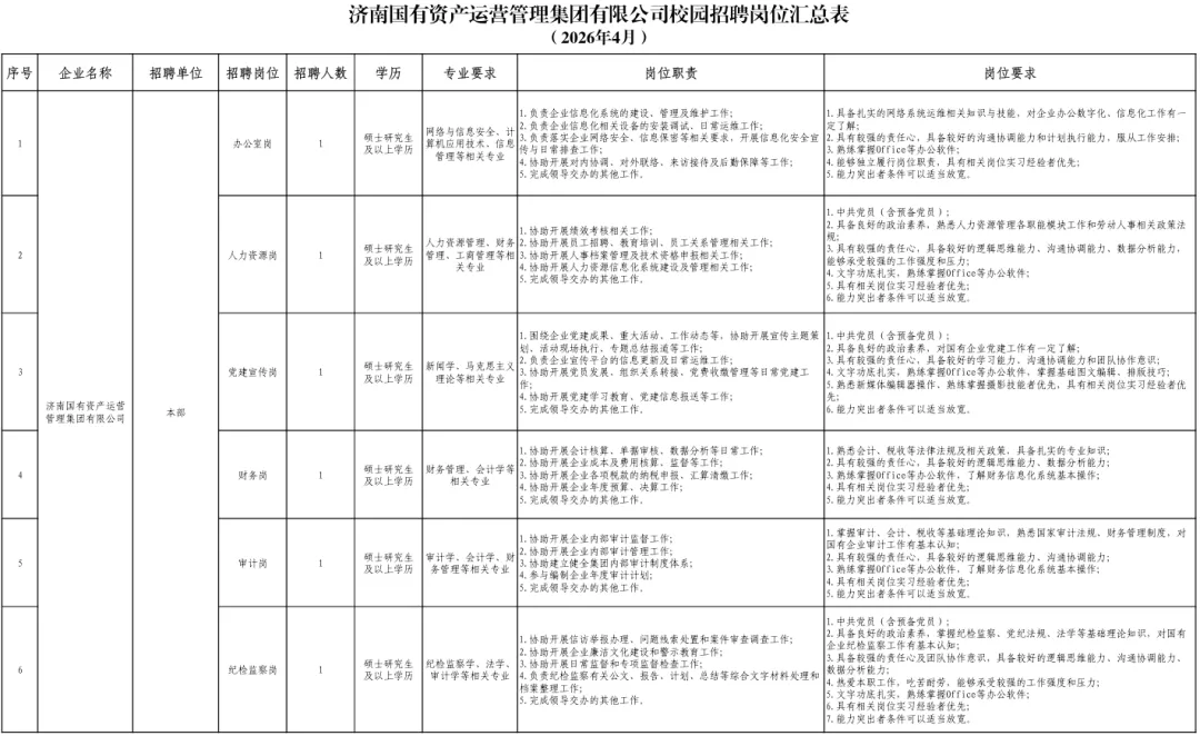 本次公开招聘岗位涵盖集团本部及所属企业,包括校园招聘19个岗位、24人,社会招聘10个岗位、10人。具体招聘岗位及岗位要求详见附件1《济南国有资产运营管理集团有限公司校园招聘岗位汇总表》、附件2《济南国有资产运营管理集团有限公司社会招聘岗位汇总表》。
