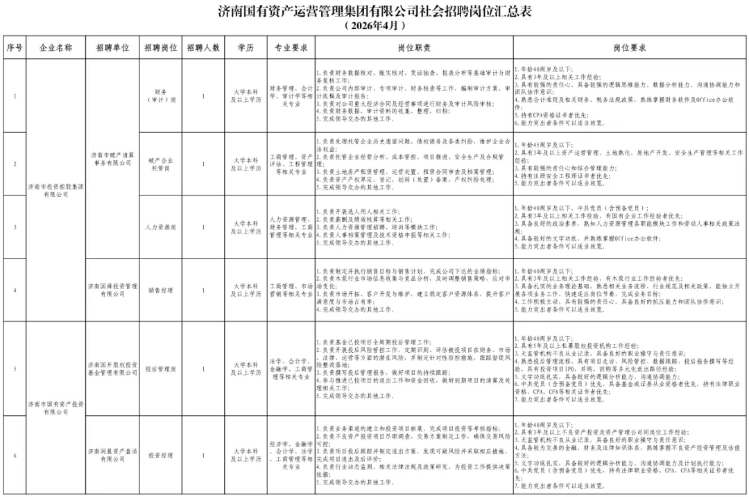 南京紫金投资2026社会化招聘济南国有资产运营管理集团有限公司权属公司招聘简章