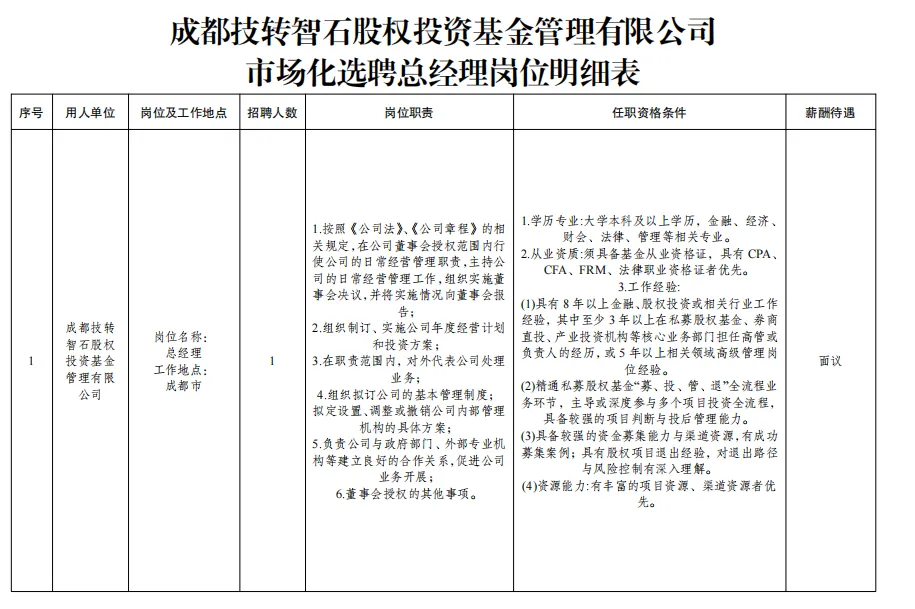 此次市场化选聘成都技转智石股权投资基金管理有限公司总经理1名(招聘岗位及任职资格要求等信息详见附件)。