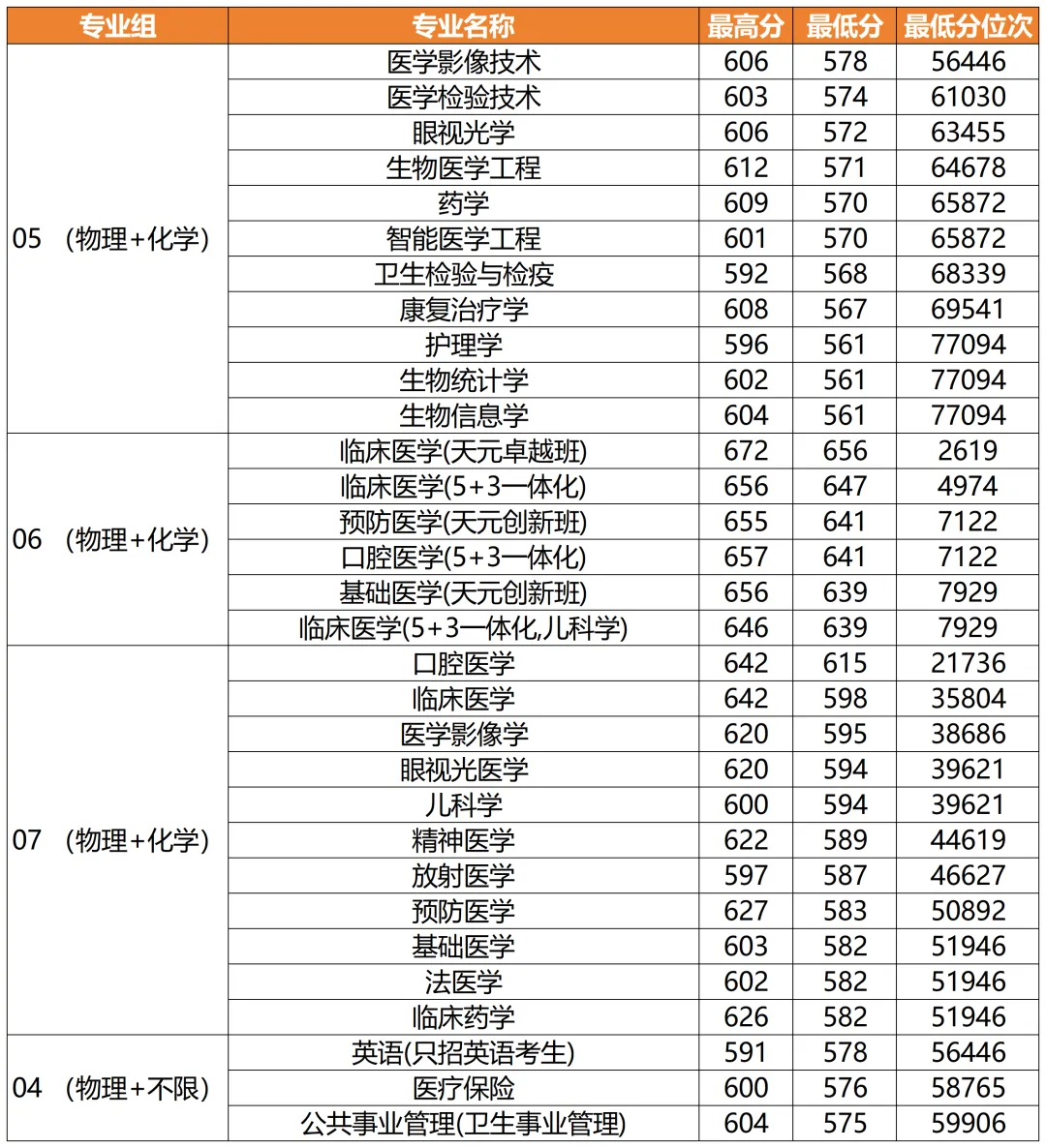 南京医科大学2025年专业录取分数(物理类)