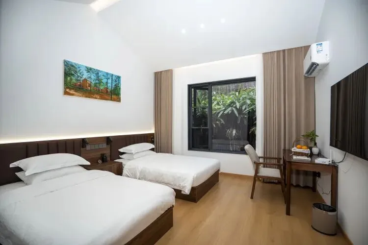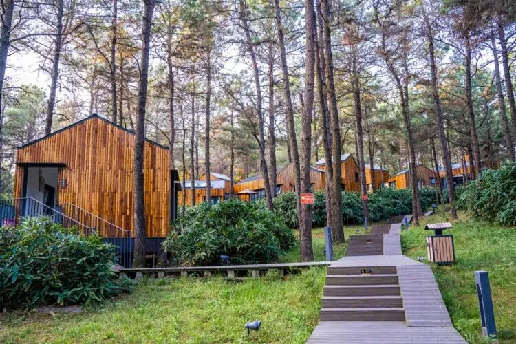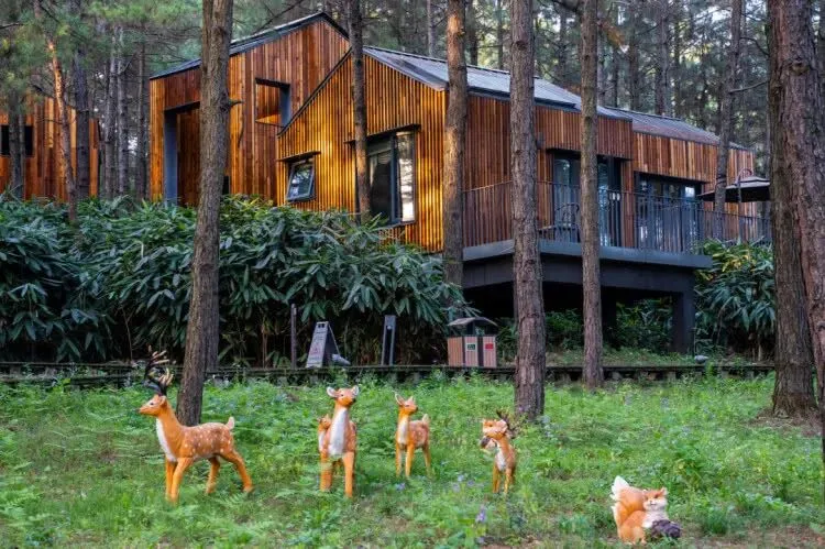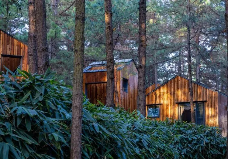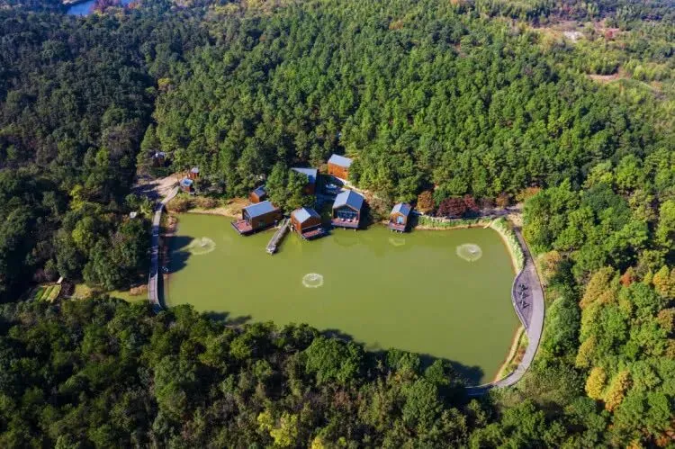 传统的酒店客房都是将各功能区集中布置与一个大的空间内,而慢城枕松度假酒店与地景相呼应,不破坏自然环境,以松散灵活的组合方式形成自由群落,充分利用周边的自然景观。