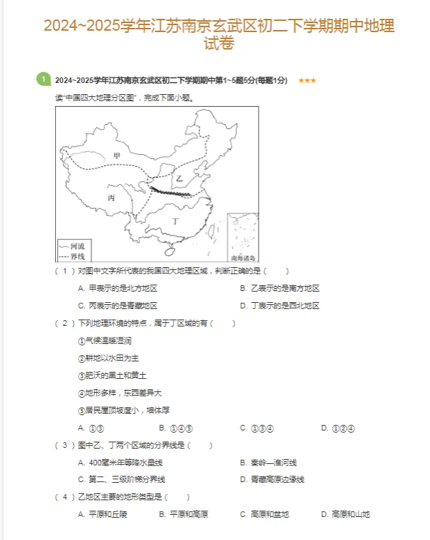 6套2021-2025学年南京各区初二下学期期中地理真题及答案解析