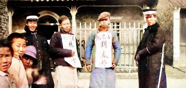 图里这一幕老南京人都晓得,两名囚犯胸前挂着白纸,写着丢包犯,后头一个穿制服的巡警,神气地杵着,院门口一排看热闹的孩子,眼里有害怕也有新鲜。