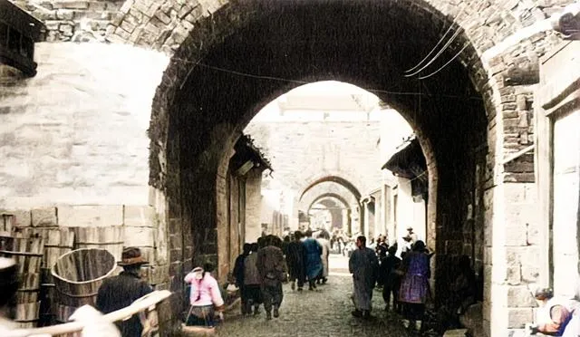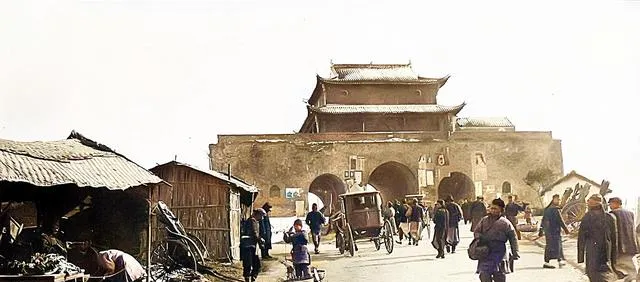 南京老城的城门,高高矗着,一层黄旧的土,门洞里人来车往,一顶轿子摇摇晃晃慢慢进,菜摊货担沿街摆,地上灰尘卷着草根,城门外又挤着等活的、说闲话的,谁都不着急。