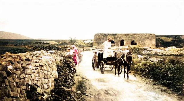 这驴队慢慢拐进小路,几个穿洋衣裳的女人盘着帽檐,骑在毛驴背上,走得不紧不慢,身后是老城门的影子,池塘边水光清亮。