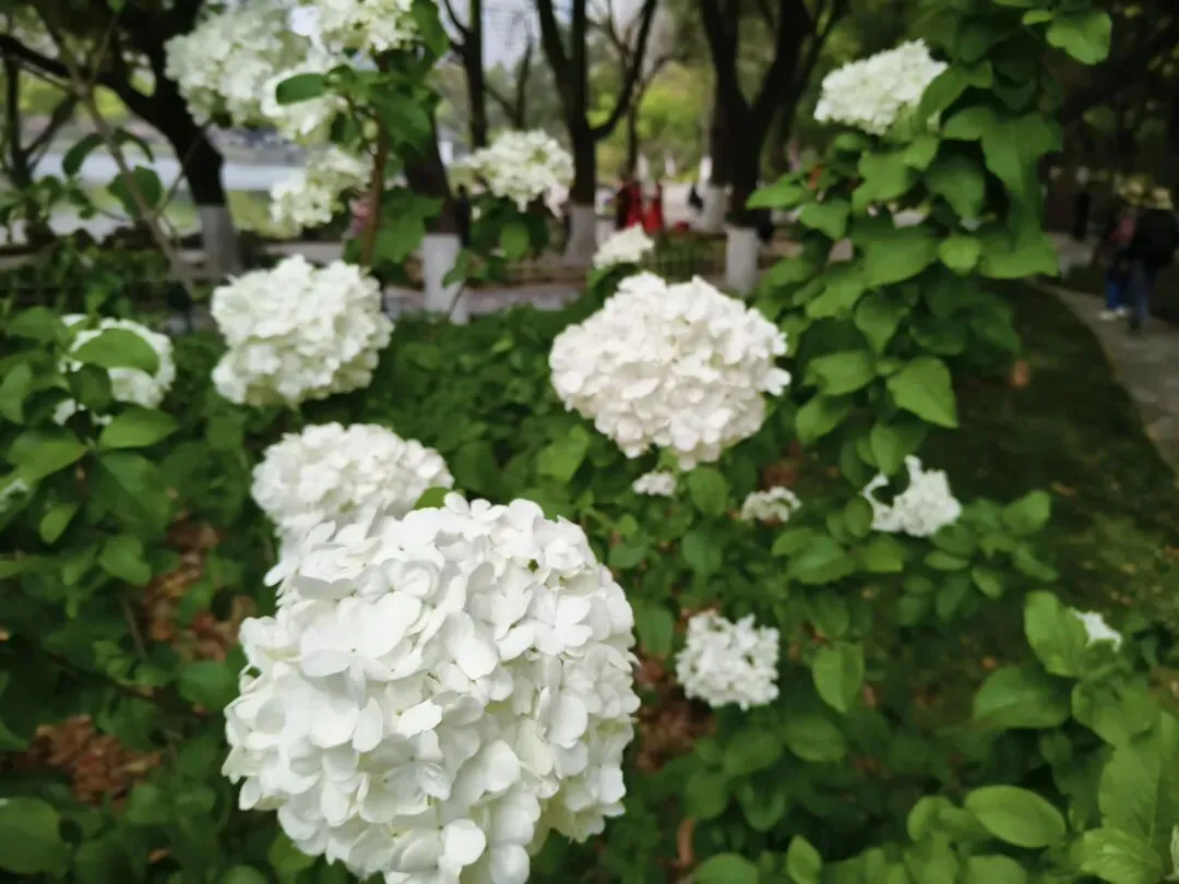 汉服少女穿梭花间,裙摆飞扬,与白绣球相映成趣,成了公园里最灵动的风景。
