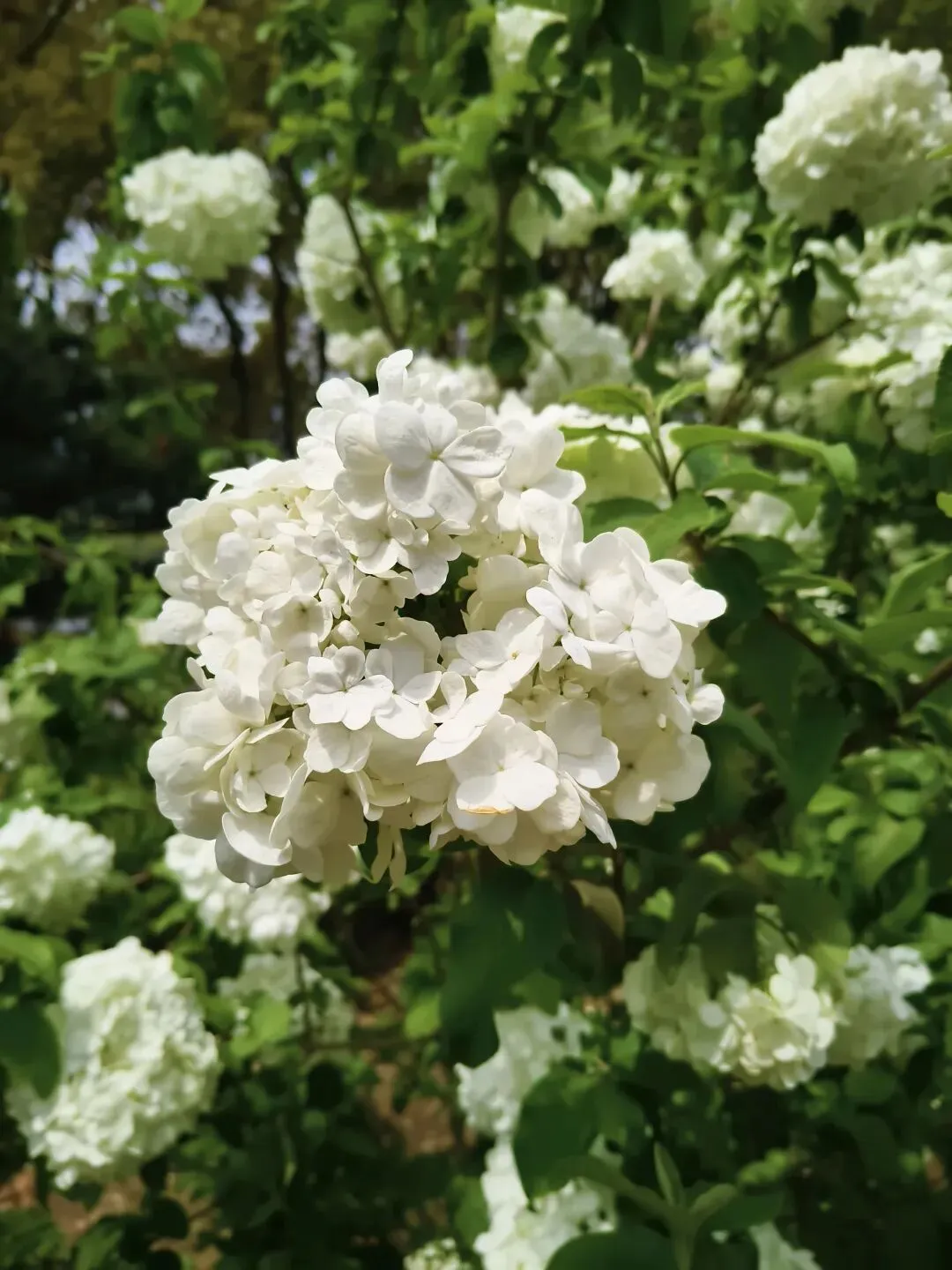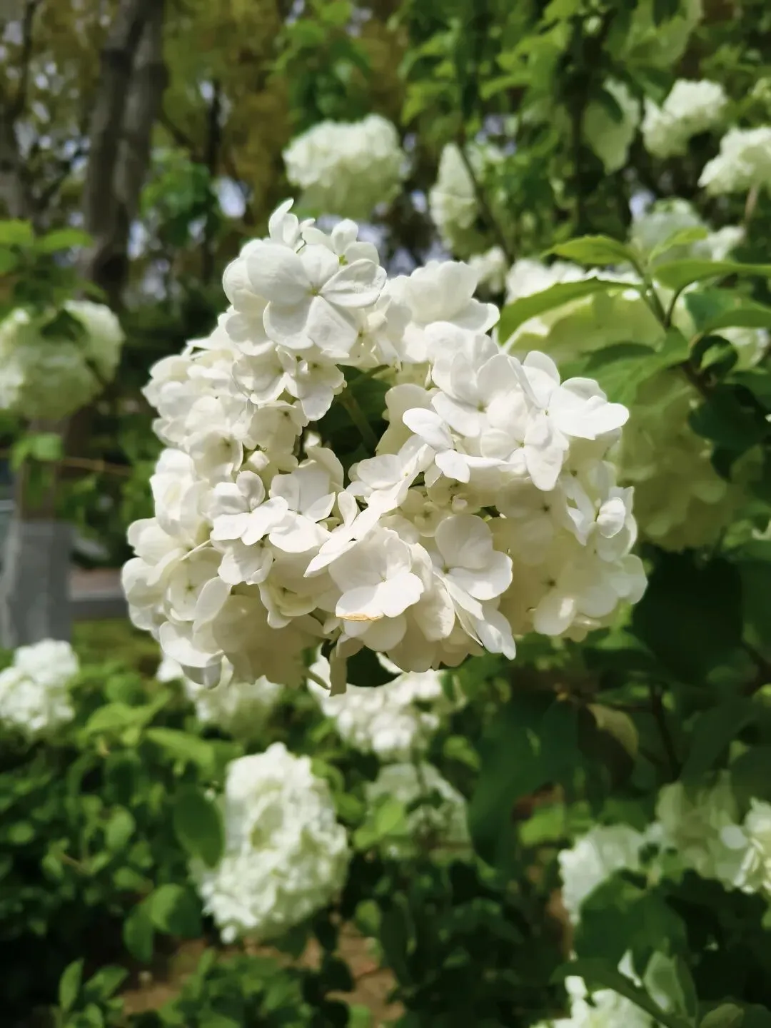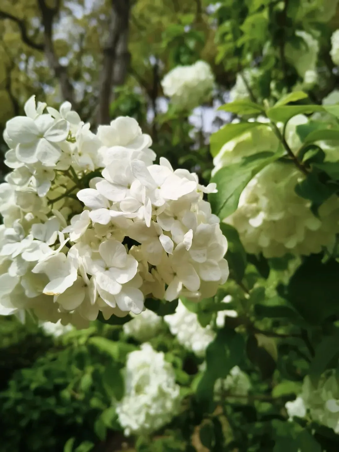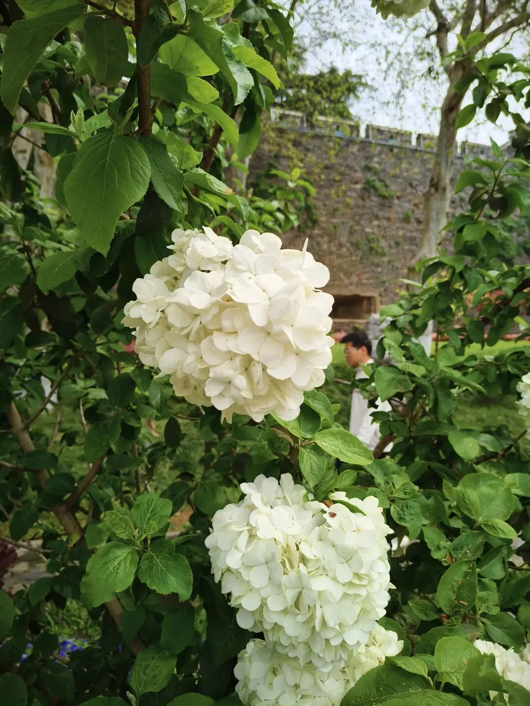最绝的是明城墙与绣球的同框。斑驳的青砖带着岁月的厚重感,高大的水杉筛下细碎的阳光,洒在洁白的花球上。正如诗中所写: