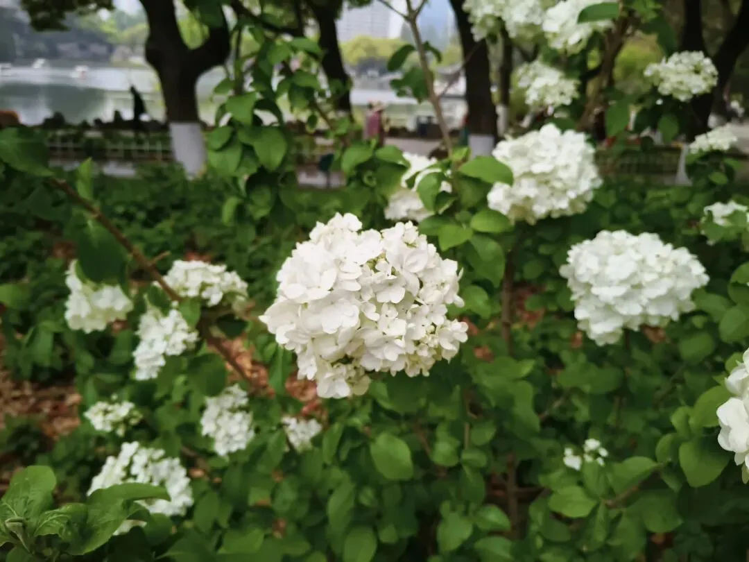 一眼望去,白的像落了层雪,粉的像打翻了胭脂罐,蓝紫的像揉碎了晚霞,一团团、一簇簇挤挤挨挨,把绣球山、城墙根、湖边岸都染成了彩色。
