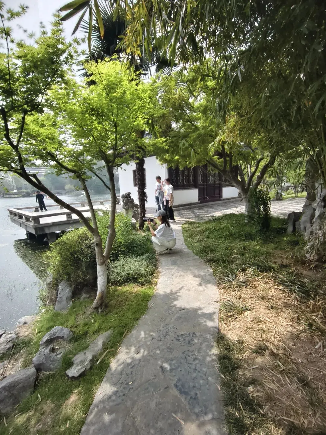 4. 湖边栈道:临水赏花,花枝倒映在湖面,光影灵动,适合拍清新氛围感照片。