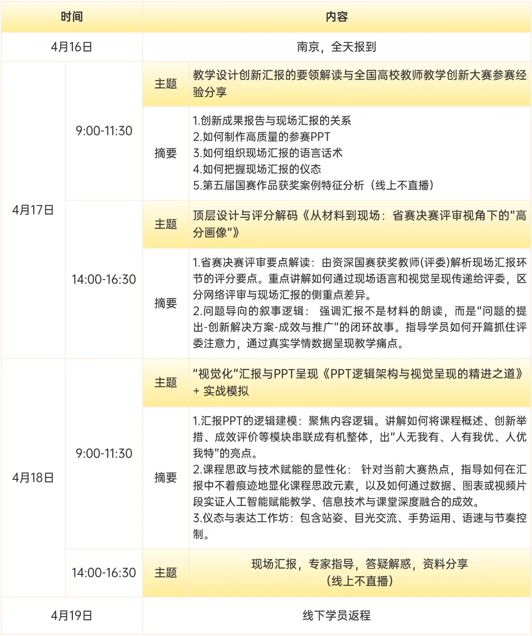为助力高校教师积极备赛第六届高校教师教学创新大赛“省赛”之“教学设计创新汇报”,掌握“教学设计创新汇报”的核心关键与展示要点,卓越国培特举办本期特训班。