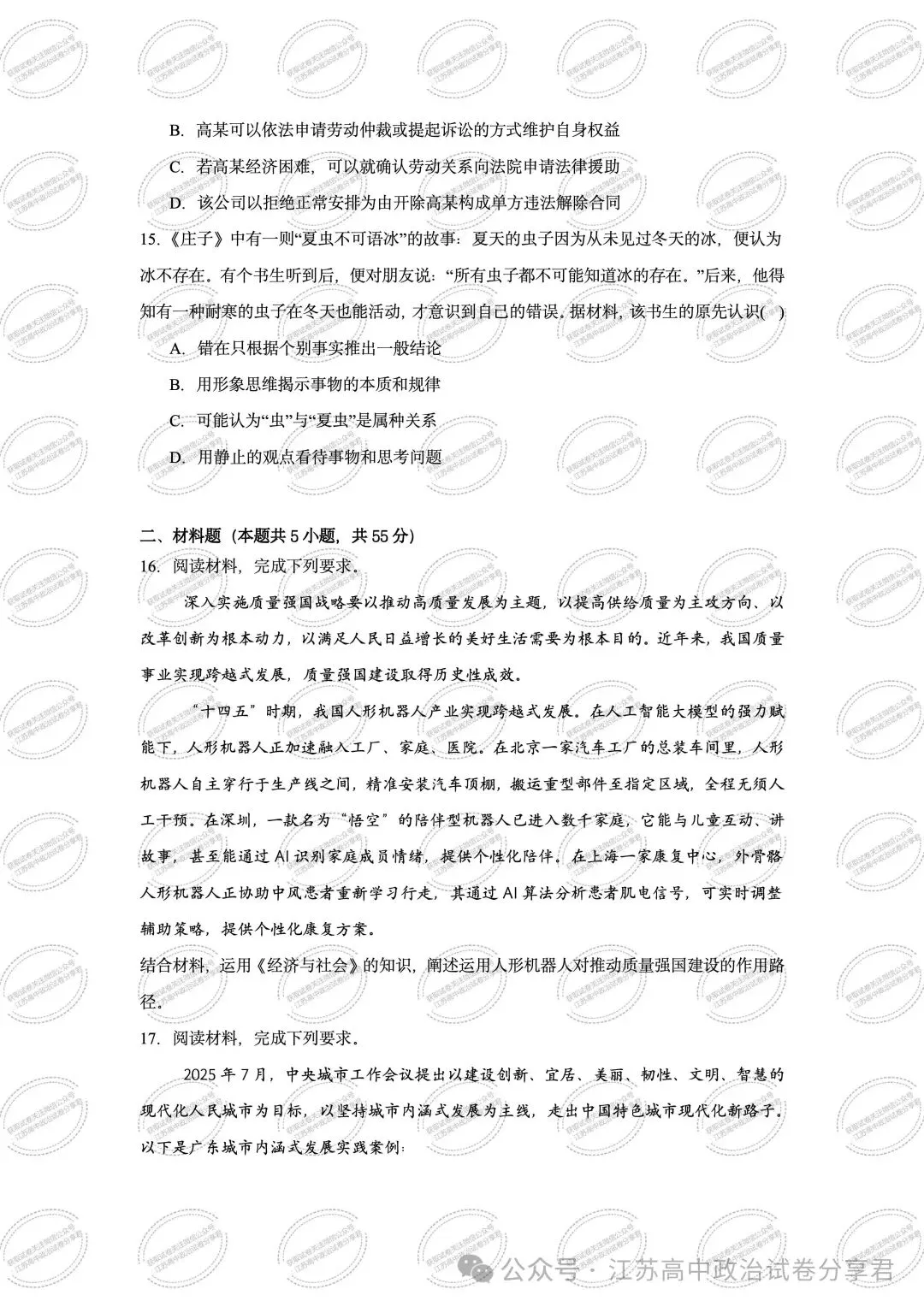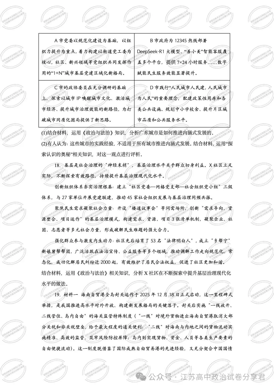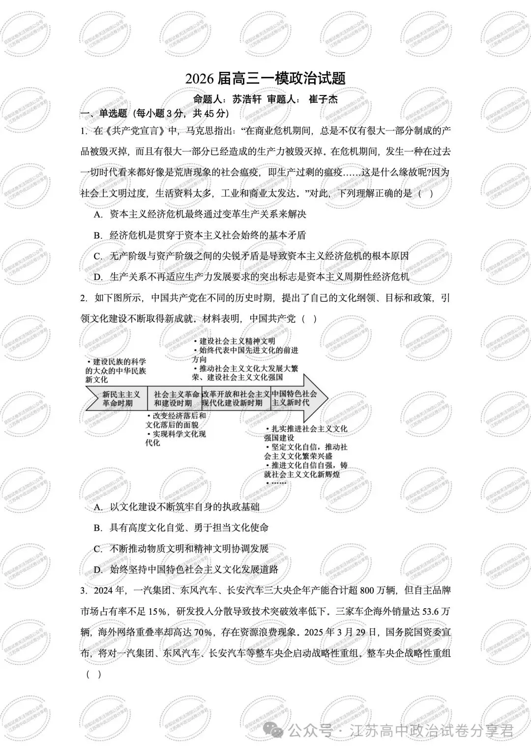 2026届江苏南京市金陵中学高三下学期一模政治试题+答案(2026.3)