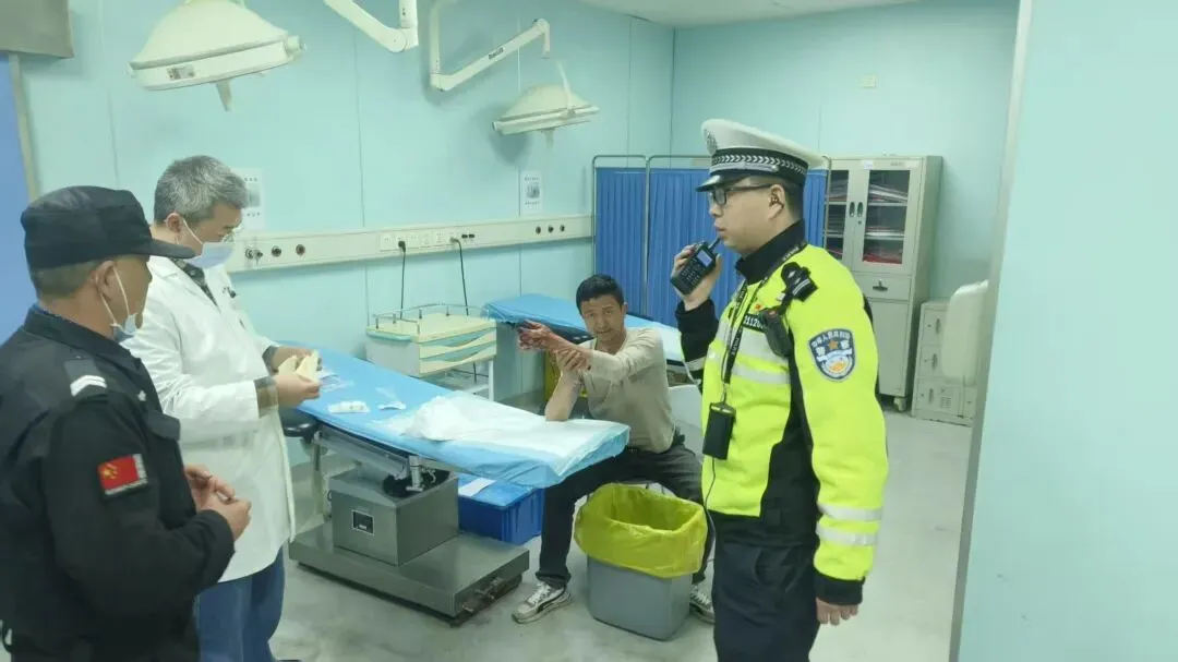▲交警将受伤工人紧急护送至医院。拍摄:胡园园