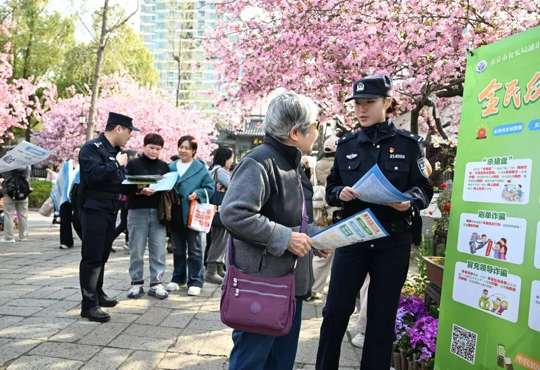 ▲建邺分局民警在景区普及反诈知识。拍摄:国武研学活动聚集地,不仅是安保的重点,也是反诈宣传的“黄金阵地”。南京警方抓住假期人流集中的契机,将反诈宣传阵地前移至家长和孩子们身边。“阿姨,手机支付停车费要小心陌生链接!”“小朋友,说送你游戏皮肤的千万别信!”在莫愁湖公园海棠花会,建邺分局民警将反诈知识融入春日游园,游客一边赏花一边听防骗知识。