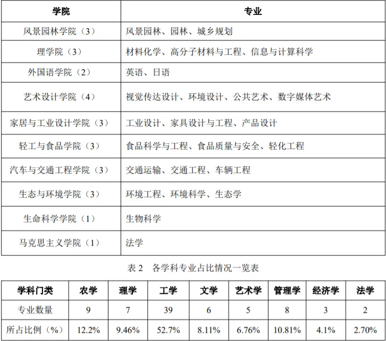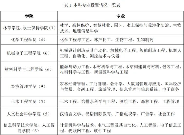 2023-2024学年,学校有本科在校生专业74个(见表1),当年招生专业 67个,涵盖了8个学科门类(见表2)。学校有2个中外合作办学专业,分别是林学和木材科学与工程。