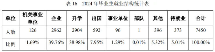 2024年共有本科毕业生7469人,实际毕业人数7450人,毕业率为99.75%,学位授予率为97.04%。7450人毕业生去向落实7077人,应届本科毕业生初次就业率为95%。2024届毕业生攻读研究生人数2904人,占毕业生总数的38.98%,出国人数592,占毕业生总数的7.95%。